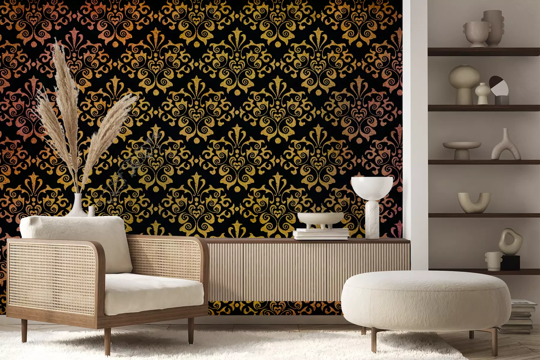 Het materiaal Premium+ is een gestructureerd vinyl op vlies met een gewicht van 255 g/m², dat kleine oneffenheden in de muur effectief camoufleert. De subtiele structuur van fijn zand geeft het oppervlak een exclusieve uitstraling, terwijl de halfmatte afwerking de diepte van de kleuren benadrukt. Het materiaal is dampdoorlatend, waardoor het ook in de keuken en badkamer kan worden gebruikt. De maximale breedte van één baan bedraagt 100 cm – bij grotere afmetingen wordt het fotobehang in meerdere gelijke banen verdeeld. De lijm wordt direct op de muur aangebracht en het behang wordt rand-aan-rand geplakt, wat zorgt voor een esthetisch resultaat zonder zichtbare naden. Het oppervlak kan gemakkelijk worden schoongemaakt door het voorzichtig af te nemen met een vochtige doek.