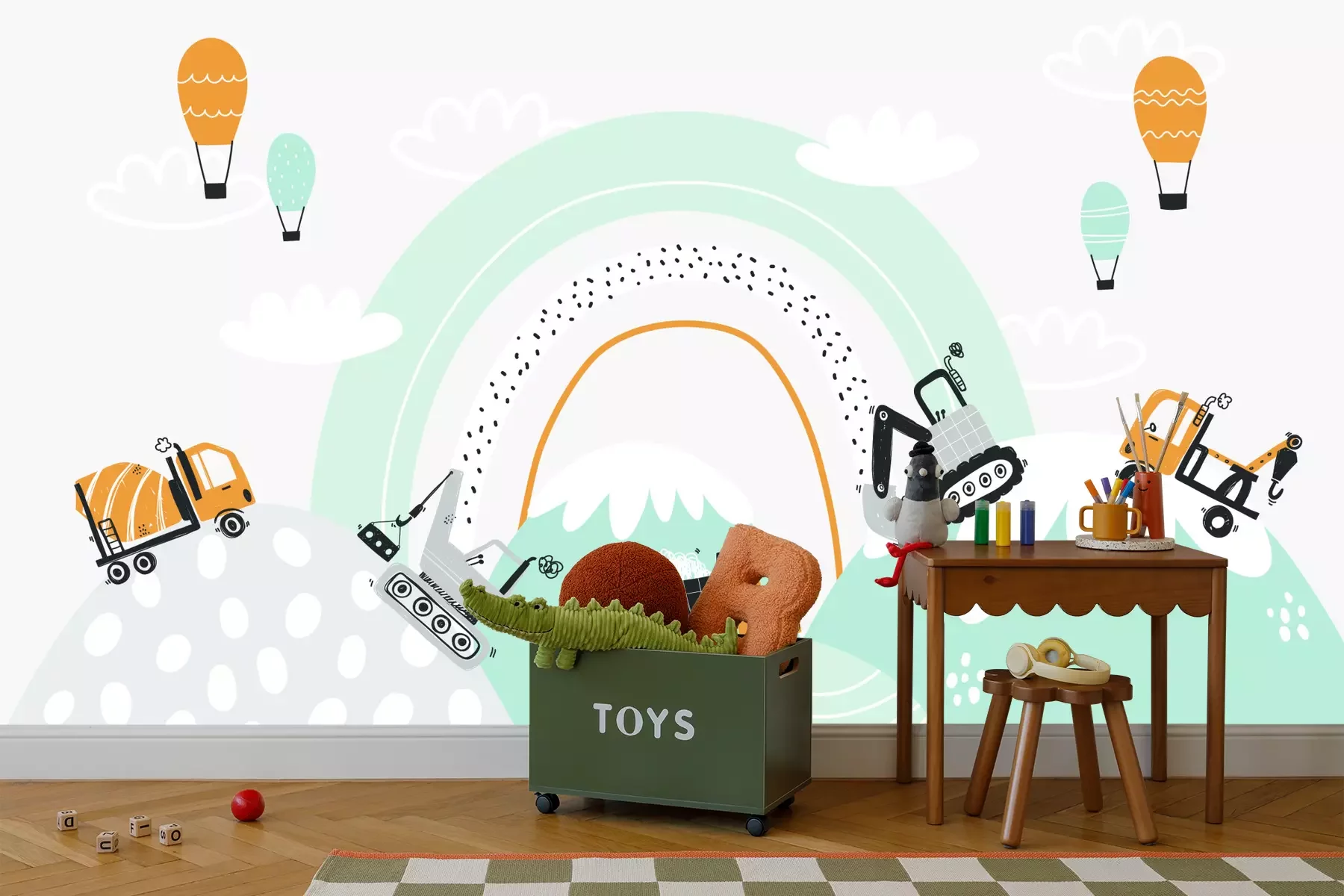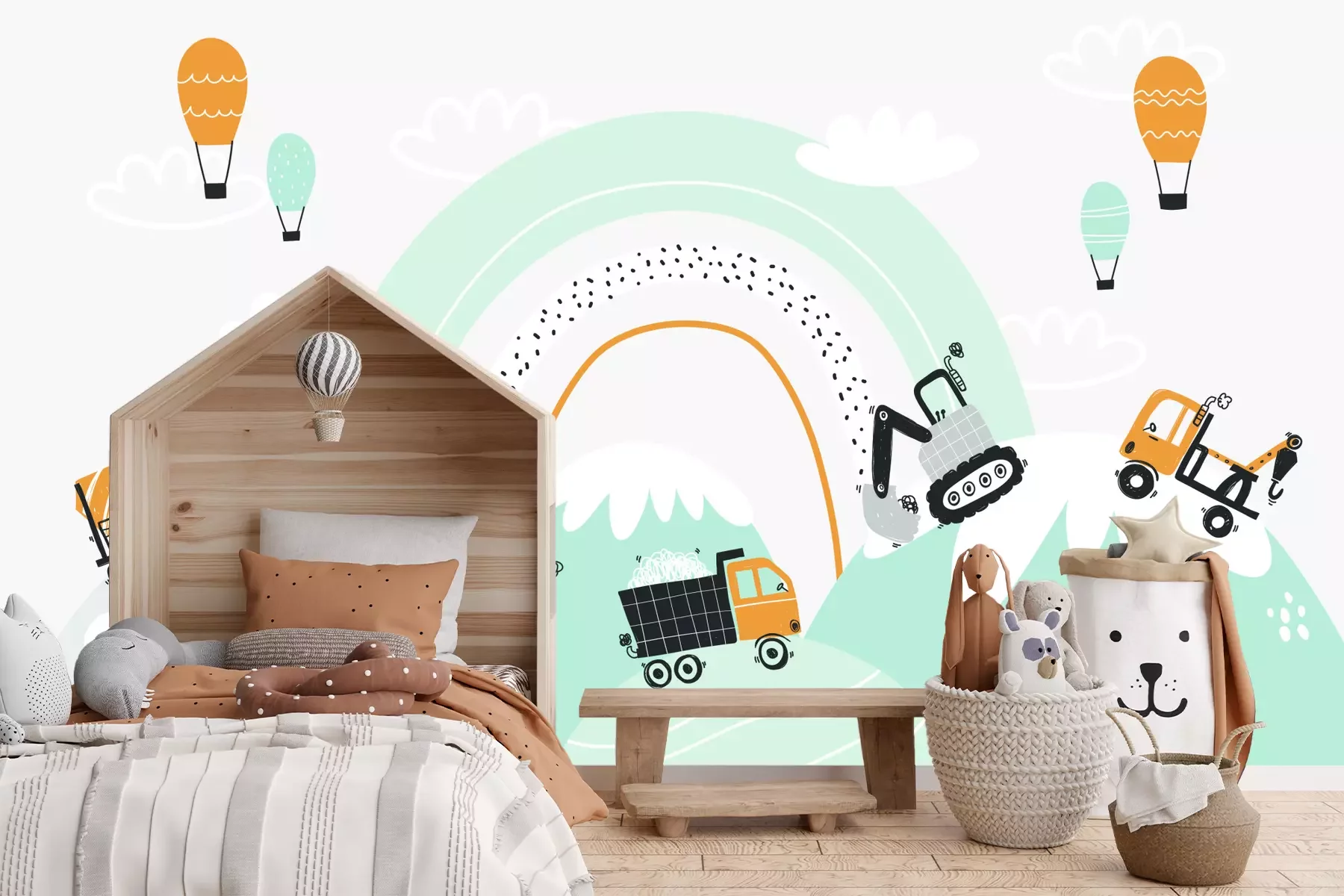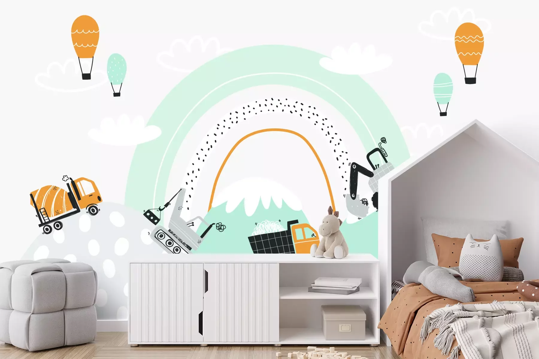 Een indrukwekkende en tegelijkertijd betaalbare manier om de kinderkamer op te frissen is met een passend fotobehang. Graafmachines en bouwvoertuigen, die het hoofdthema van ons product vormen, zijn de perfecte keuze voor het rijk van een kleine autoliefhebber. De opvallende grafische elementen, geplaatst tegen een regenboogachtergrond, zijn ontworpen in een moderne stijl en in pastelkleuren. Subtiele tinten grijs, mint, wit en levendige honingkleurige accenten verwijzen naar het kleurenpalet dat vaak voorkomt in Scandinavische interieurs. Bij het inrichten van een kinderkamer is het de moeite waard om hiermee rekening te houden, om zo een samenhangend en harmonieus interieur te creëren waarin ons fotobehang een belangrijk element wordt. Tekening, geïnspireerd op een thema dat geliefd is bij jongens, trekt de aandacht met zijn interessante compositie. Lijnen en stippen die zichtbaar zijn in het ontwerp van fotobehang het geven extra karakter. Graafmachines en andere elementen op de tekening prikkelen de fantasie van kinderen en creëren een inspirerende omgeving. Je kind kan in een kamer met sprookjesachtig fotobehang heerlijk ontspannen én genieten van elke dag. Voertuigen, gerangschikt in een ritmisch patroon, zijn niet alleen decoratief, maar stimuleren ook creatieve spelletjes. Je hoeft je echter geen zorgen te maken over beschadigingen op het fotobehang tijdens het spelen. De hoge kwaliteit van ons product zorgt ervoor dat het bijzonder krasbestendig is. De eenvoudige reiniging van het oppervlak is nog een extra voordeel – vooral belangrijk in een ruimte die gebruikt wordt door de jongste gezinsleden, voor wie ons fotobehang ontworpen is. Voertuigen in pasteltinten zien er niet alleen prachtig uit in huiselijke interieurs, maar ook in kinderdagverblijven, scholen of speelruimtes. Je kunt er zeker van zijn dat dankzij de hoge printkwaliteit alle grafische elementen langdurig hun oorspronkelijke kleuren behouden. De verschillende tinten passen harmonieus bij interieurs met houten meubels en accessoires zoals wolkvormige kussens, posters met voertuigen of linnen gordijnen. Bovendien hoef je je geen zorgen te maken over de montage van dit fotobehang voor jongens, want het is gemaakt van een materiaal dat voorkomt dat er luchtbellen ontstaan. Hierdoor verloopt de montage soepel en is het eindresultaat zowel esthetisch als duurzaam indrukwekkend.