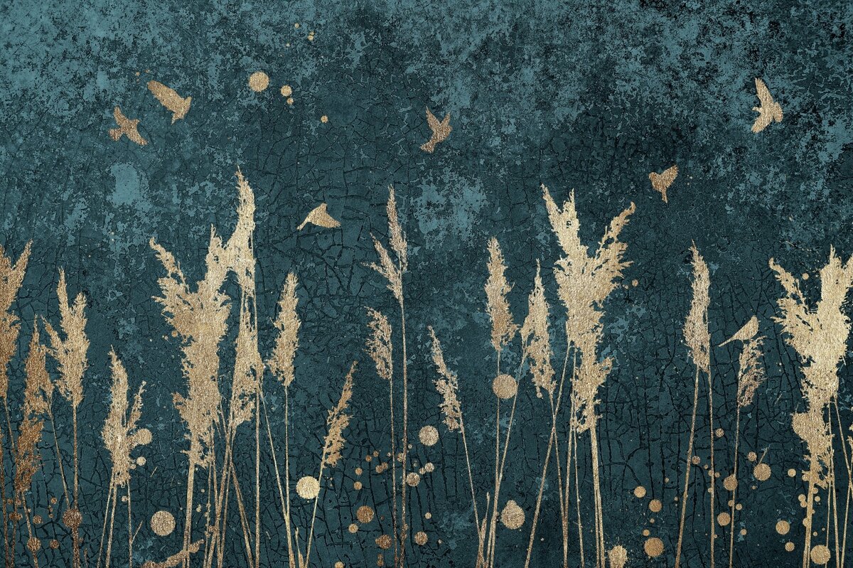 Fotobehang: Grassen en vogels op een betonnen achtergrond
