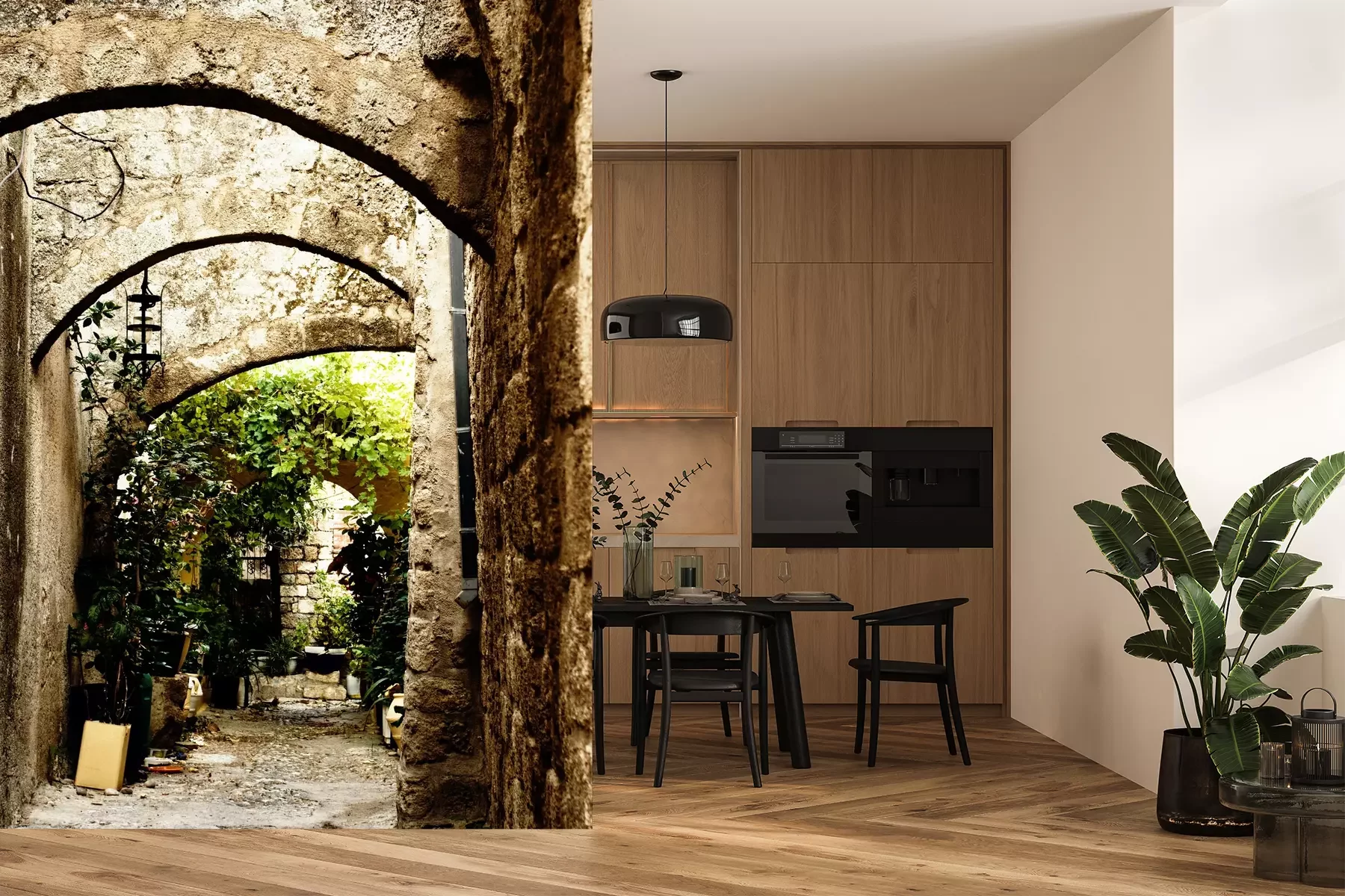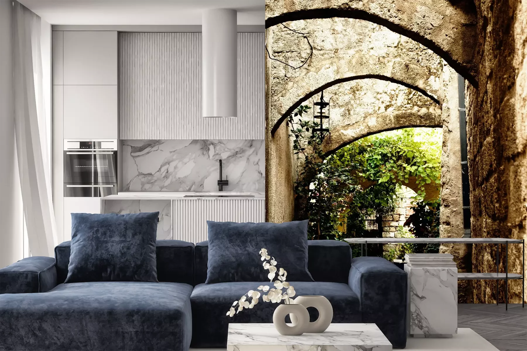 Het materiaal Premium is een glad vinyl op vlies, dat bestand is tegen uitrekken en vervorming. Het is dampdoorlatend – de muren kunnen vrij ademen – waardoor het geschikt is voor gebruik in de keuken en badkamer. Bij vervuiling kan het materiaal worden afgenomen met een vochtige doek. De maximale breedte van één baan bedraagt 95 of 105 cm, afhankelijk van de beschikbaarheid. Montage vindt plaats met de rand-aan-rand methode, wat een esthetisch resultaat zonder zichtbare naden oplevert. Omdat de lijm rechtstreeks op de muur wordt aangebracht, verloopt de installatie van het fotobehang snel en eenvoudig.