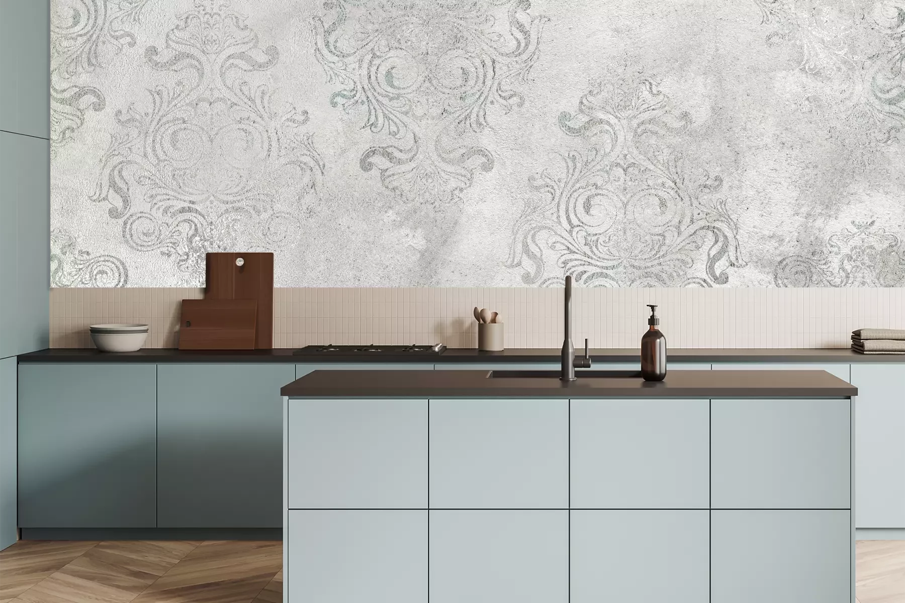 Het materiaal Premium is een glad vinyl op vlies, dat bestand is tegen uitrekken en vervorming. Het is dampdoorlatend – de muren kunnen vrij ademen – waardoor het geschikt is voor gebruik in de keuken en badkamer. Bij vervuiling kan het materiaal worden afgenomen met een vochtige doek. De maximale breedte van één baan bedraagt 95 of 105 cm, afhankelijk van de beschikbaarheid. Montage vindt plaats met de rand-aan-rand methode, wat een esthetisch resultaat zonder zichtbare naden oplevert. Omdat de lijm rechtstreeks op de muur wordt aangebracht, verloopt de installatie van het fotobehang snel en eenvoudig.