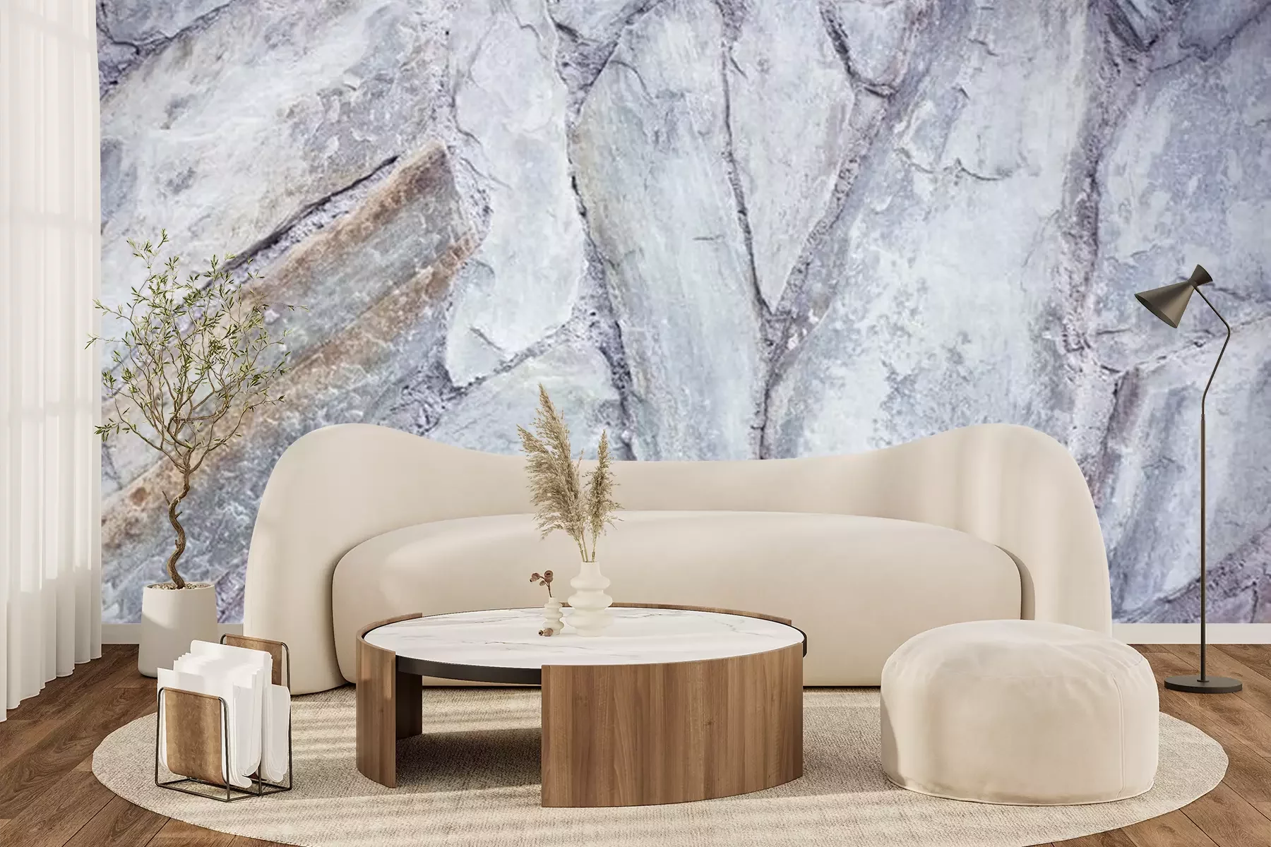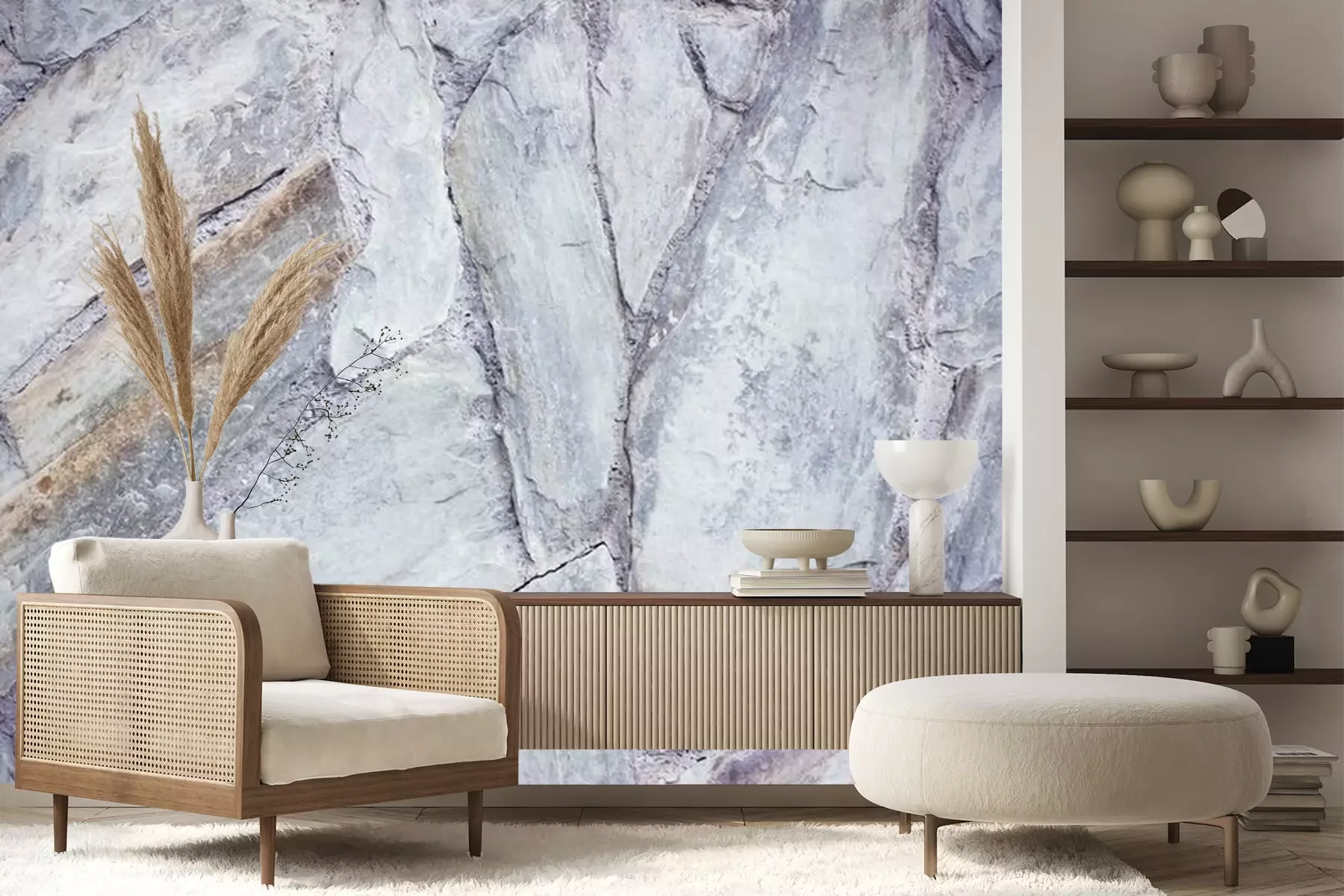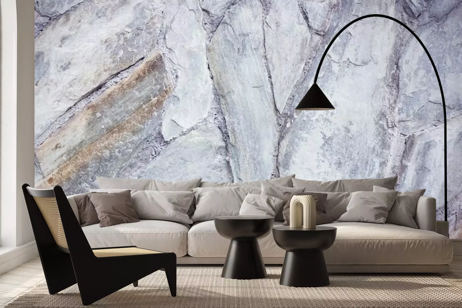 Het materiaal Premium+ is een gestructureerd vinyl op vlies met een gewicht van 255 g/m², dat kleine oneffenheden in de muur effectief camoufleert. De subtiele structuur van fijn zand geeft het oppervlak een exclusieve uitstraling, terwijl de halfmatte afwerking de diepte van de kleuren benadrukt. Het materiaal is dampdoorlatend, waardoor het ook in de keuken en badkamer kan worden gebruikt. De maximale breedte van één baan bedraagt 100 cm – bij grotere afmetingen wordt het fotobehang in meerdere gelijke banen verdeeld. De lijm wordt direct op de muur aangebracht en het behang wordt rand-aan-rand geplakt, wat zorgt voor een esthetisch resultaat zonder zichtbare naden. Het oppervlak kan gemakkelijk worden schoongemaakt door het voorzichtig af te nemen met een vochtige doek.