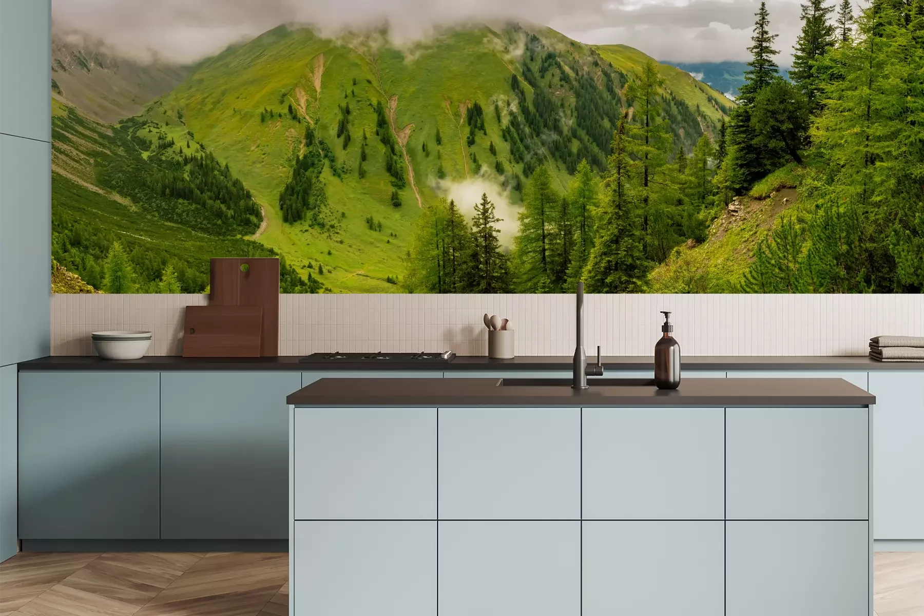 Het materiaal Premium is een glad vinyl op vlies, dat bestand is tegen uitrekken en vervorming. Het is dampdoorlatend – de muren kunnen vrij ademen – waardoor het geschikt is voor gebruik in de keuken en badkamer. Bij vervuiling kan het materiaal worden afgenomen met een vochtige doek. De maximale breedte van één baan bedraagt 95 of 105 cm, afhankelijk van de beschikbaarheid. Montage vindt plaats met de rand-aan-rand methode, wat een esthetisch resultaat zonder zichtbare naden oplevert. Omdat de lijm rechtstreeks op de muur wordt aangebracht, verloopt de installatie van het fotobehang snel en eenvoudig.