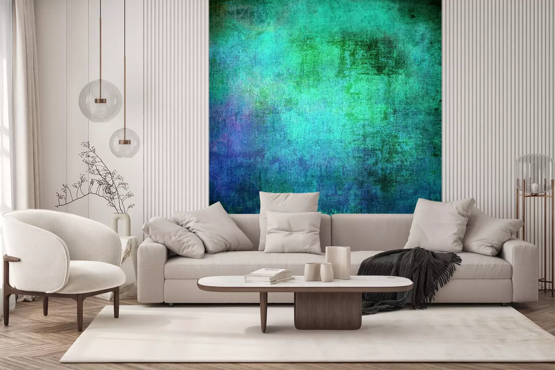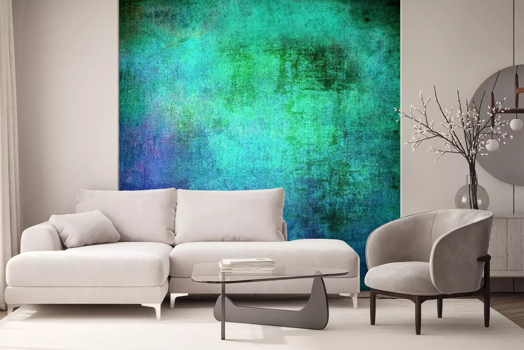 Het materiaal Premium+ is een gestructureerd vinyl op vlies met een gewicht van 255 g/m², dat kleine oneffenheden in de muur effectief camoufleert. De subtiele structuur van fijn zand geeft het oppervlak een exclusieve uitstraling, terwijl de halfmatte afwerking de diepte van de kleuren benadrukt. Het materiaal is dampdoorlatend, waardoor het ook in de keuken en badkamer kan worden gebruikt. De maximale breedte van één baan bedraagt 100 cm – bij grotere afmetingen wordt het fotobehang in meerdere gelijke banen verdeeld. De lijm wordt direct op de muur aangebracht en het behang wordt rand-aan-rand geplakt, wat zorgt voor een esthetisch resultaat zonder zichtbare naden. Het oppervlak kan gemakkelijk worden schoongemaakt door het voorzichtig af te nemen met een vochtige doek.