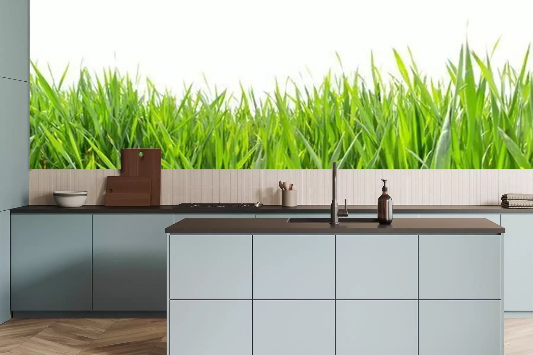 Het materiaal Premium is een glad vinyl op vlies, dat bestand is tegen uitrekken en vervorming. Het is dampdoorlatend – de muren kunnen vrij ademen – waardoor het geschikt is voor gebruik in de keuken en badkamer. Bij vervuiling kan het materiaal worden afgenomen met een vochtige doek. De maximale breedte van één baan bedraagt 95 of 105 cm, afhankelijk van de beschikbaarheid. Montage vindt plaats met de rand-aan-rand methode, wat een esthetisch resultaat zonder zichtbare naden oplevert. Omdat de lijm rechtstreeks op de muur wordt aangebracht, verloopt de installatie van het fotobehang snel en eenvoudig.