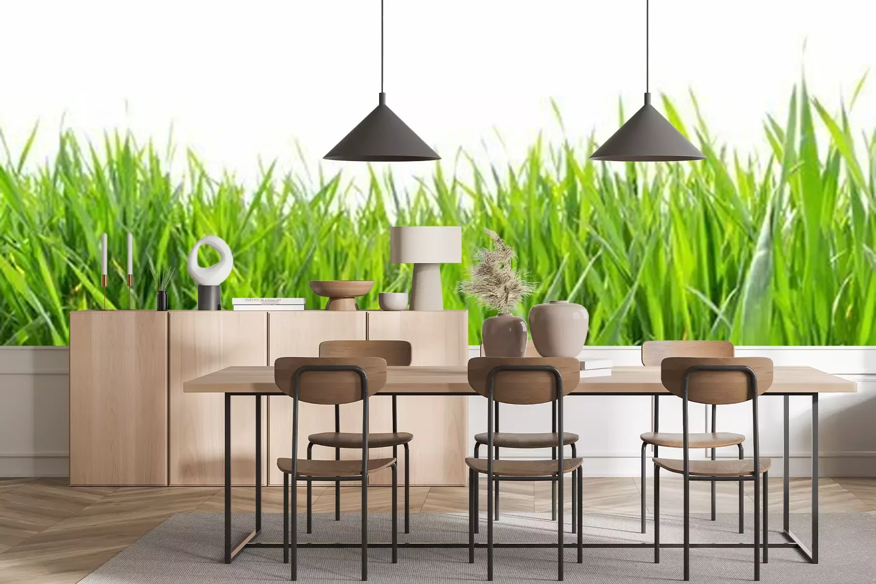 Het materiaal Premium+ is een gestructureerd vinyl op vlies met een gewicht van 255 g/m², dat kleine oneffenheden in de muur effectief camoufleert. De subtiele structuur van fijn zand geeft het oppervlak een exclusieve uitstraling, terwijl de halfmatte afwerking de diepte van de kleuren benadrukt. Het materiaal is dampdoorlatend, waardoor het ook in de keuken en badkamer kan worden gebruikt. De maximale breedte van één baan bedraagt 100 cm – bij grotere afmetingen wordt het fotobehang in meerdere gelijke banen verdeeld. De lijm wordt direct op de muur aangebracht en het behang wordt rand-aan-rand geplakt, wat zorgt voor een esthetisch resultaat zonder zichtbare naden. Het oppervlak kan gemakkelijk worden schoongemaakt door het voorzichtig af te nemen met een vochtige doek.