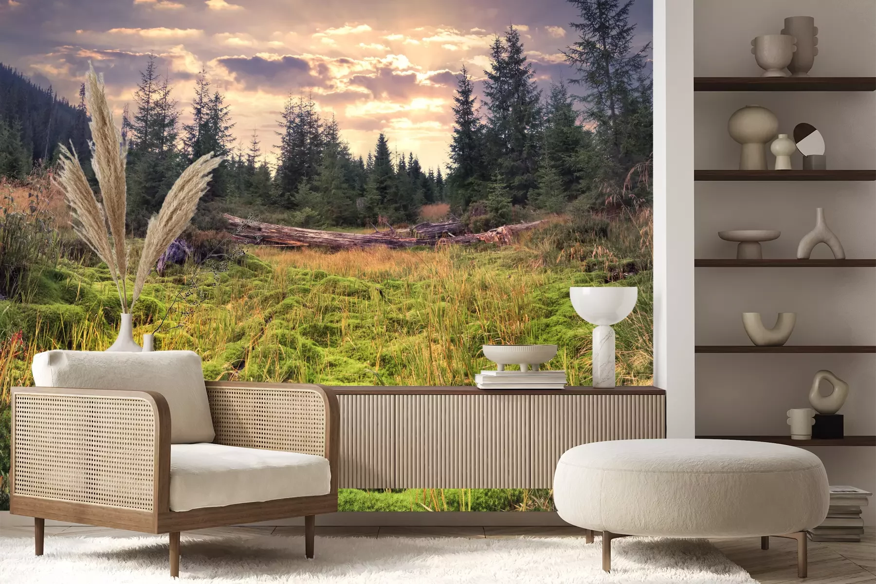 Het materiaal Premium+ is een gestructureerd vinyl op vlies met een gewicht van 255 g/m², dat kleine oneffenheden in de muur effectief camoufleert. De subtiele structuur van fijn zand geeft het oppervlak een exclusieve uitstraling, terwijl de halfmatte afwerking de diepte van de kleuren benadrukt. Het materiaal is dampdoorlatend, waardoor het ook in de keuken en badkamer kan worden gebruikt. De maximale breedte van één baan bedraagt 100 cm – bij grotere afmetingen wordt het fotobehang in meerdere gelijke banen verdeeld. De lijm wordt direct op de muur aangebracht en het behang wordt rand-aan-rand geplakt, wat zorgt voor een esthetisch resultaat zonder zichtbare naden. Het oppervlak kan gemakkelijk worden schoongemaakt door het voorzichtig af te nemen met een vochtige doek.
