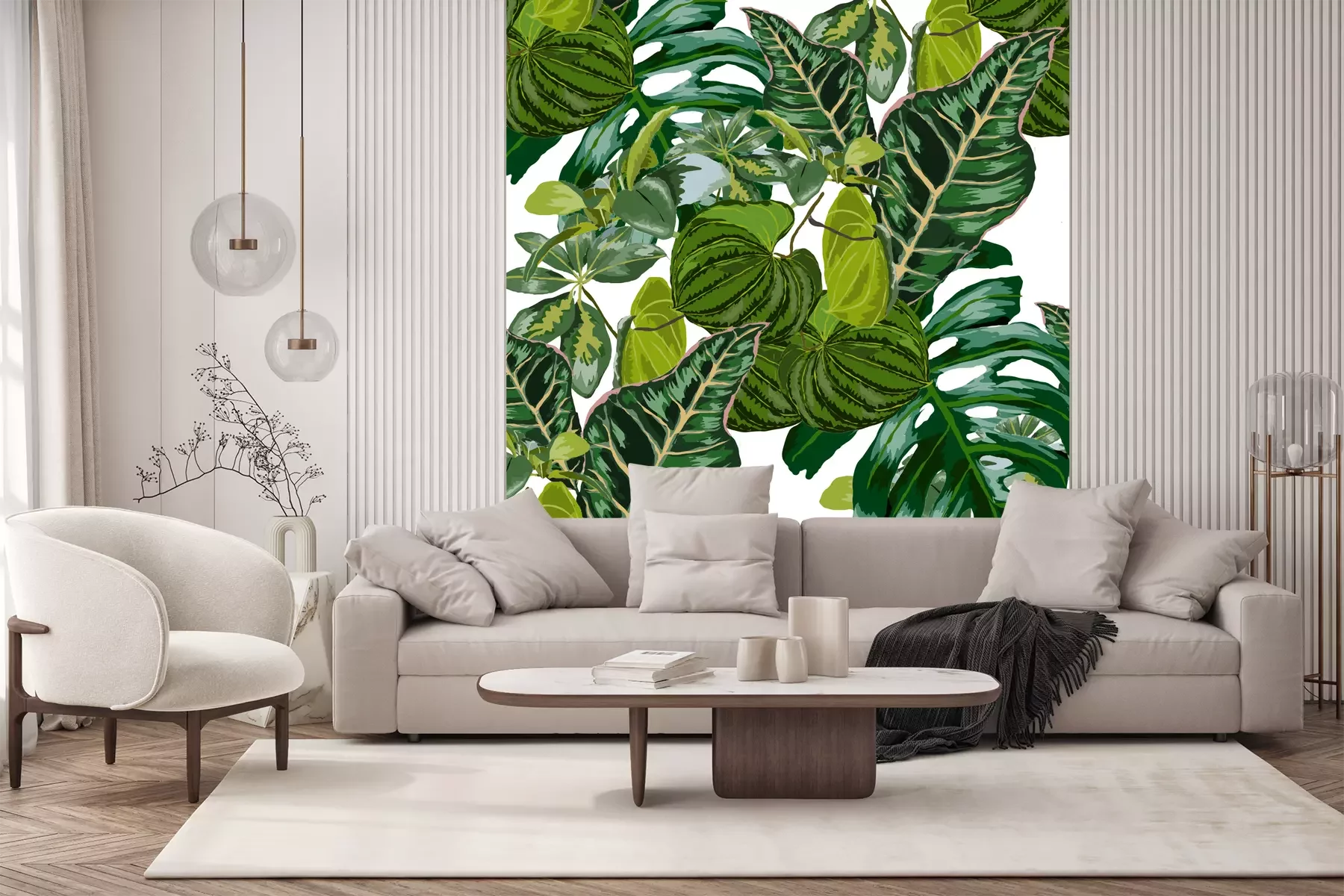 Het fotobehang wordt geleverd in banen. De afmetingen en het aantal banen waaruit het volledige fotobehang bestaat, zijn afhankelijk van het gekozen materiaal. Wanneer het formaat de maximale materiaalbreedte overschrijdt, bestaat de print uit meerdere gelijkmatige banen.