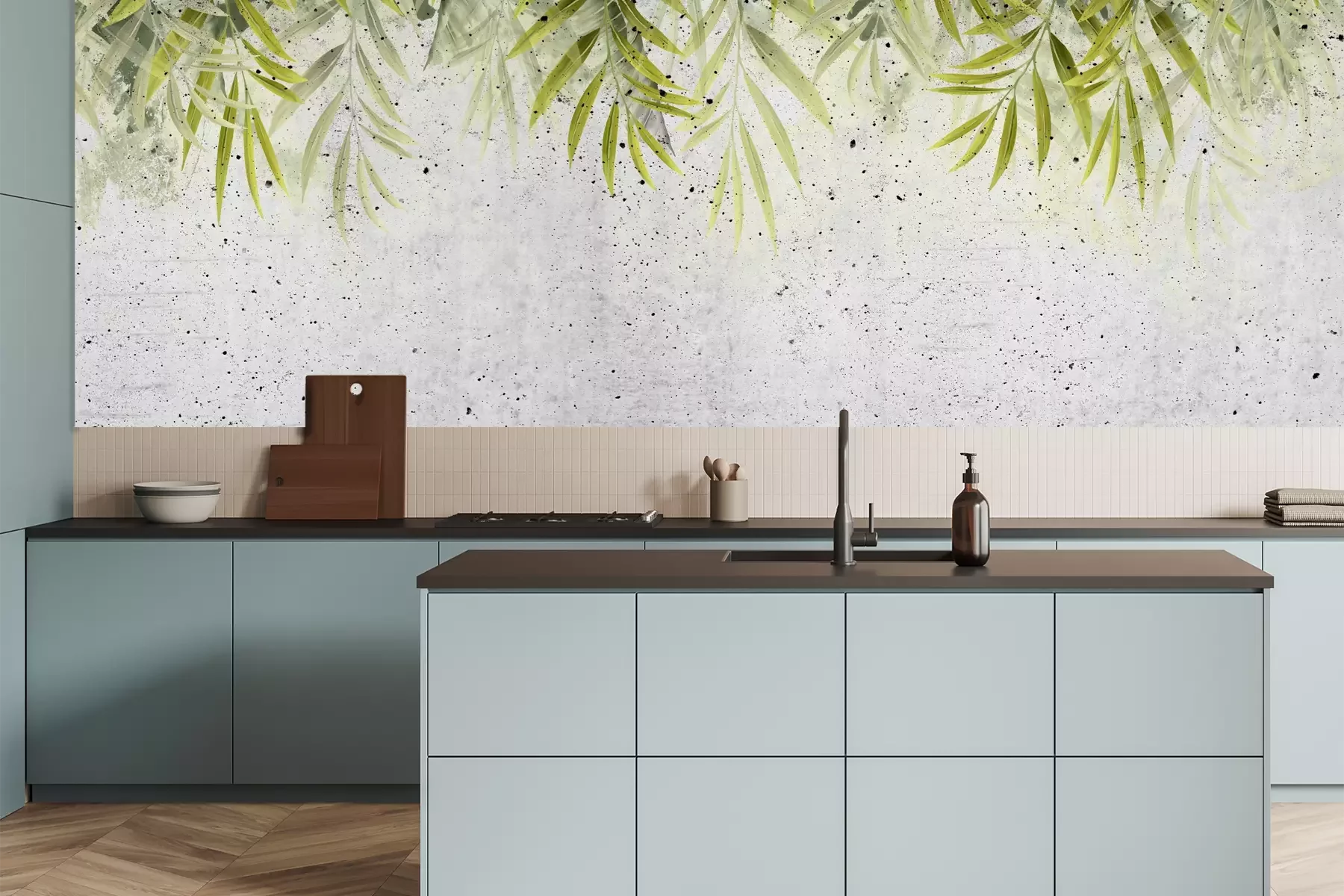 Het materiaal Premium is een glad vinyl op vlies, dat bestand is tegen uitrekken en vervorming. Het is dampdoorlatend – de muren kunnen vrij ademen – waardoor het geschikt is voor gebruik in de keuken en badkamer. Bij vervuiling kan het materiaal worden afgenomen met een vochtige doek. De maximale breedte van één baan bedraagt 95 of 105 cm, afhankelijk van de beschikbaarheid. Montage vindt plaats met de rand-aan-rand methode, wat een esthetisch resultaat zonder zichtbare naden oplevert. Omdat de lijm rechtstreeks op de muur wordt aangebracht, verloopt de installatie van het fotobehang snel en eenvoudig.
