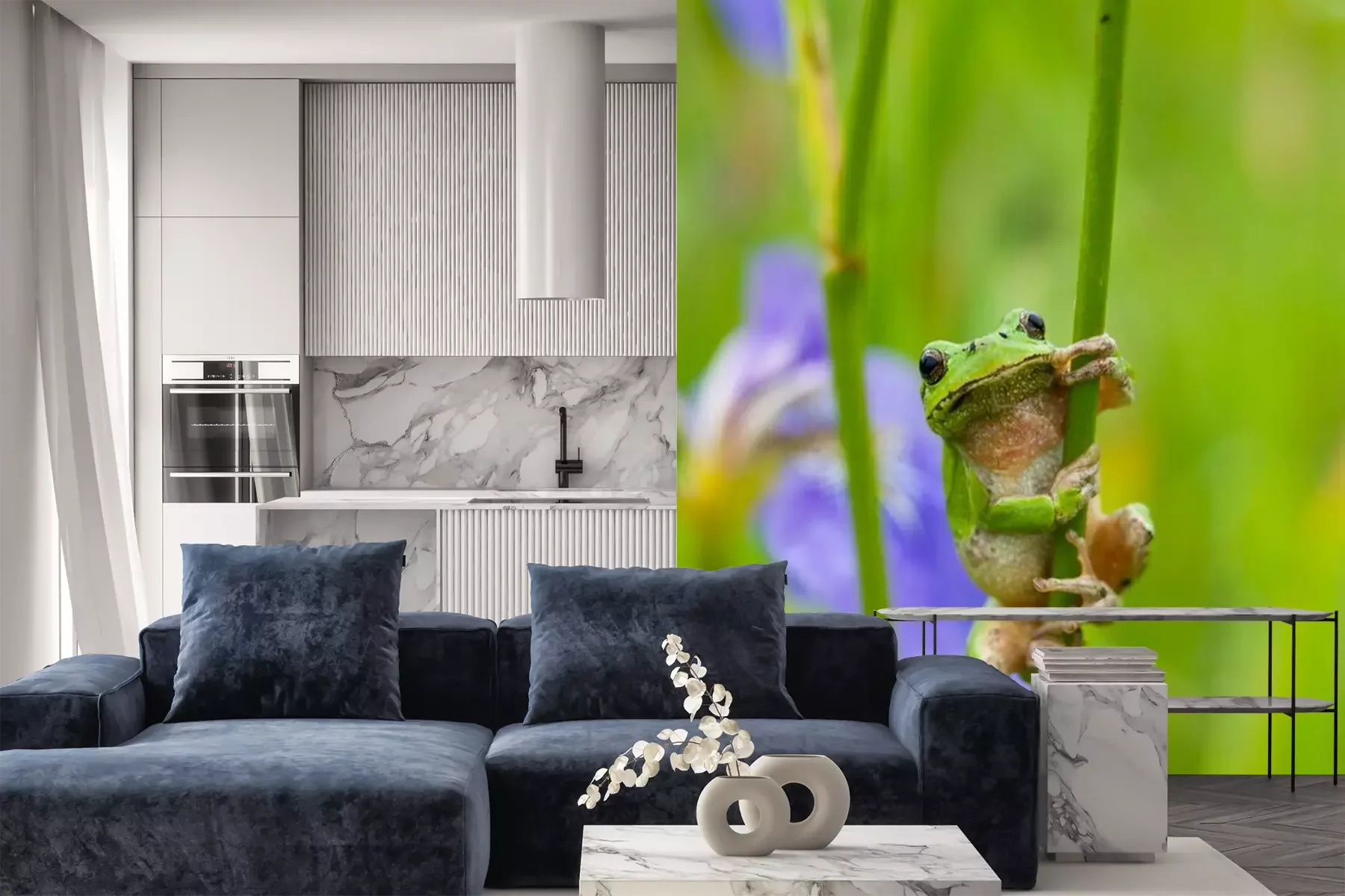 Het materiaal Premium is een glad vinyl op vlies, dat bestand is tegen uitrekken en vervorming. Het is dampdoorlatend – de muren kunnen vrij ademen – waardoor het geschikt is voor gebruik in de keuken en badkamer. Bij vervuiling kan het materiaal worden afgenomen met een vochtige doek. De maximale breedte van één baan bedraagt 95 of 105 cm, afhankelijk van de beschikbaarheid. Montage vindt plaats met de rand-aan-rand methode, wat een esthetisch resultaat zonder zichtbare naden oplevert. Omdat de lijm rechtstreeks op de muur wordt aangebracht, verloopt de installatie van het fotobehang snel en eenvoudig.