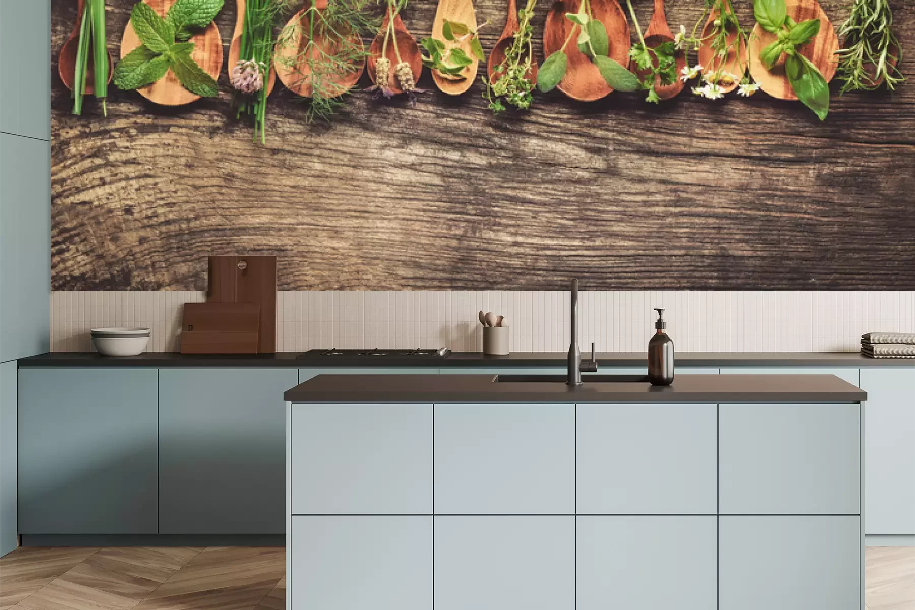 Het materiaal Premium is een glad vinyl op vlies, dat bestand is tegen uitrekken en vervorming. Het is dampdoorlatend – de muren kunnen vrij ademen – waardoor het geschikt is voor gebruik in de keuken en badkamer. Bij vervuiling kan het materiaal worden afgenomen met een vochtige doek. De maximale breedte van één baan bedraagt 95 of 105 cm, afhankelijk van de beschikbaarheid. Montage vindt plaats met de rand-aan-rand methode, wat een esthetisch resultaat zonder zichtbare naden oplevert. Omdat de lijm rechtstreeks op de muur wordt aangebracht, verloopt de installatie van het fotobehang snel en eenvoudig.