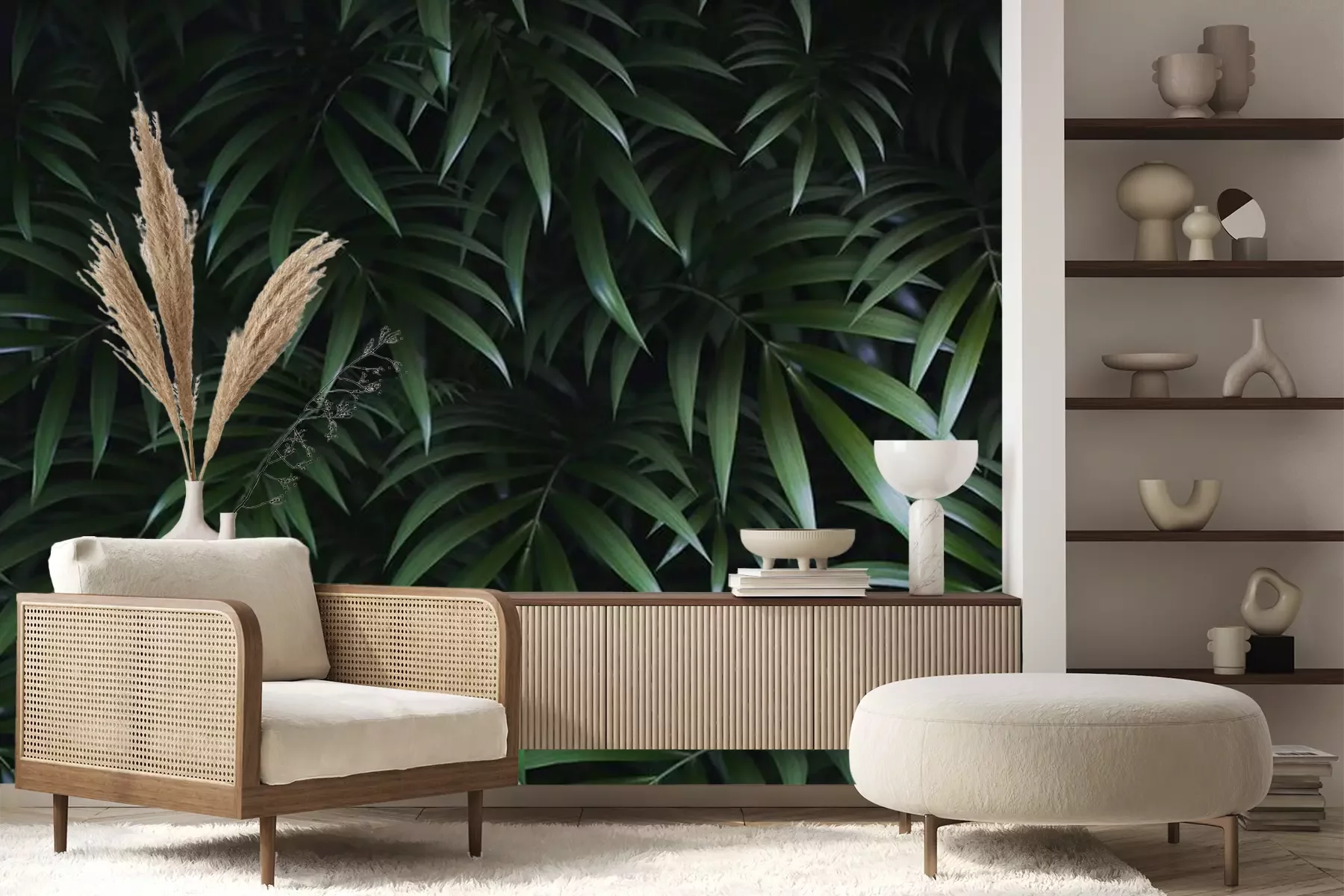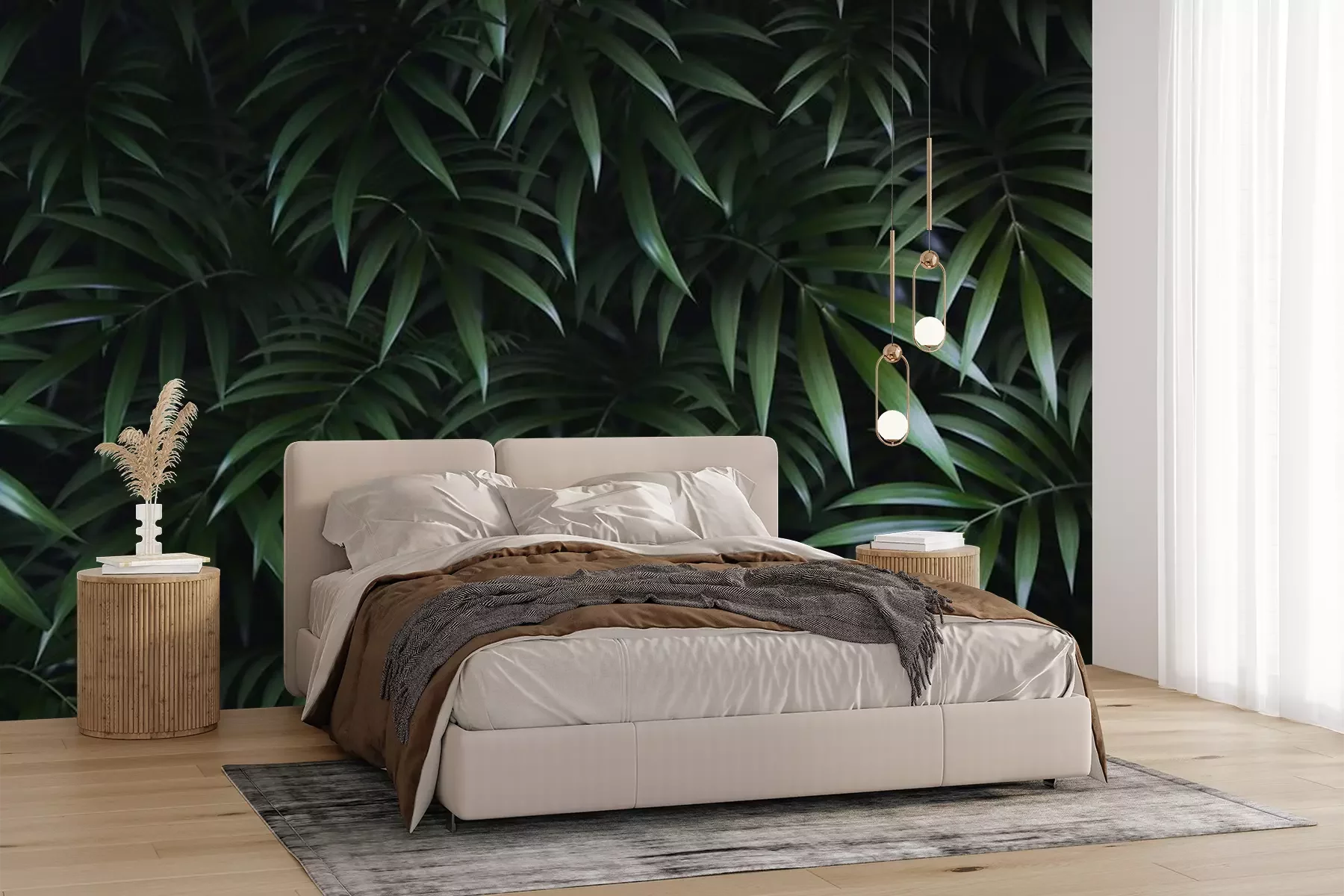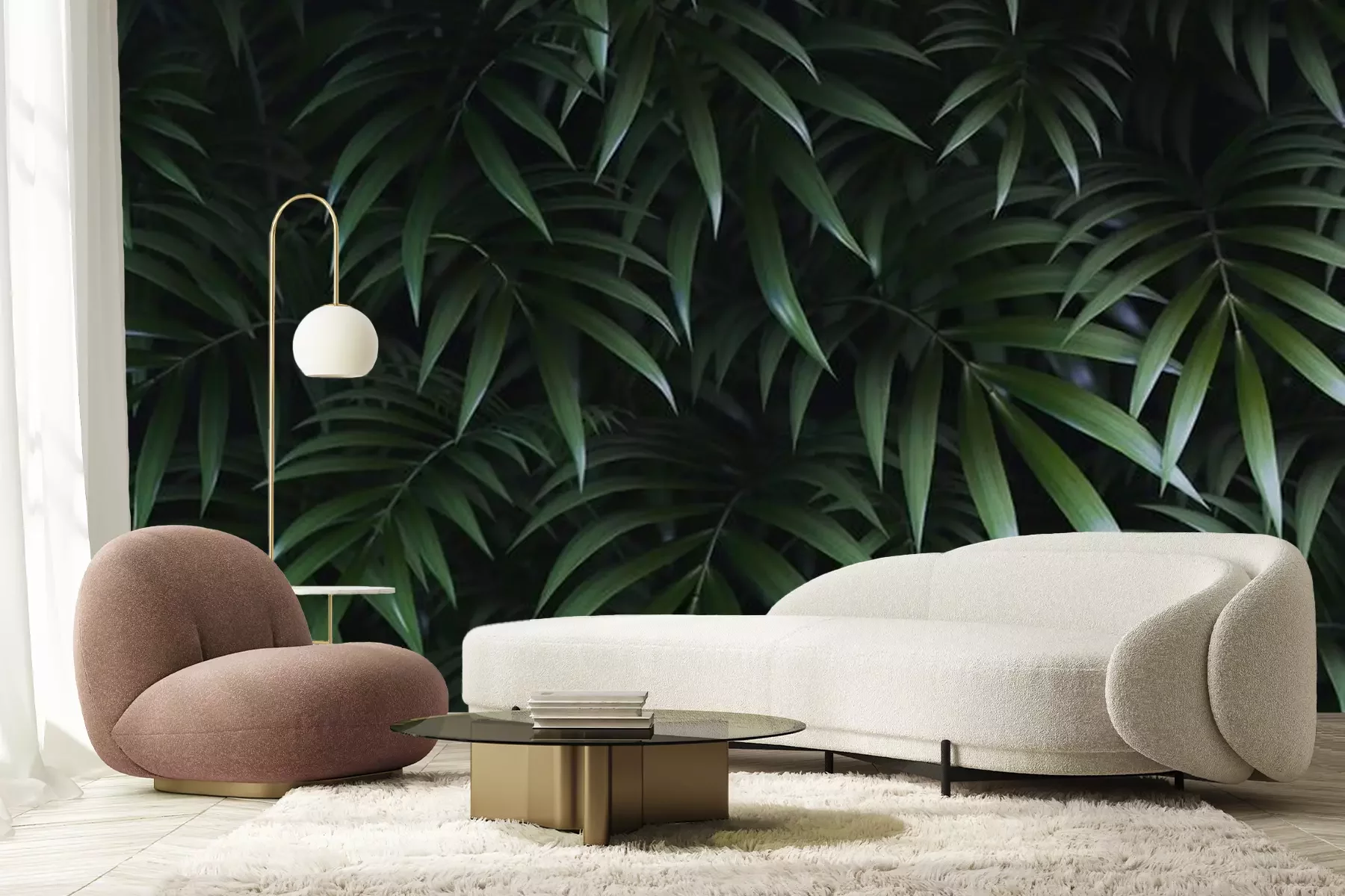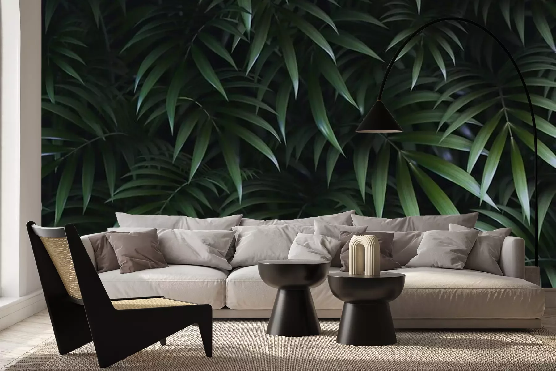 Fotobehang Groene palmbladeren op een donkere achtergrond