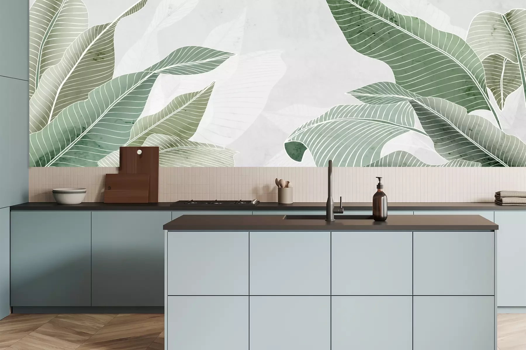 Het materiaal Premium is een glad vinyl op vlies, dat bestand is tegen uitrekken en vervorming. Het is dampdoorlatend – de muren kunnen vrij ademen – waardoor het geschikt is voor gebruik in de keuken en badkamer. Bij vervuiling kan het materiaal worden afgenomen met een vochtige doek. De maximale breedte van één baan bedraagt 95 of 105 cm, afhankelijk van de beschikbaarheid. Montage vindt plaats met de rand-aan-rand methode, wat een esthetisch resultaat zonder zichtbare naden oplevert. Omdat de lijm rechtstreeks op de muur wordt aangebracht, verloopt de installatie van het fotobehang snel en eenvoudig.
