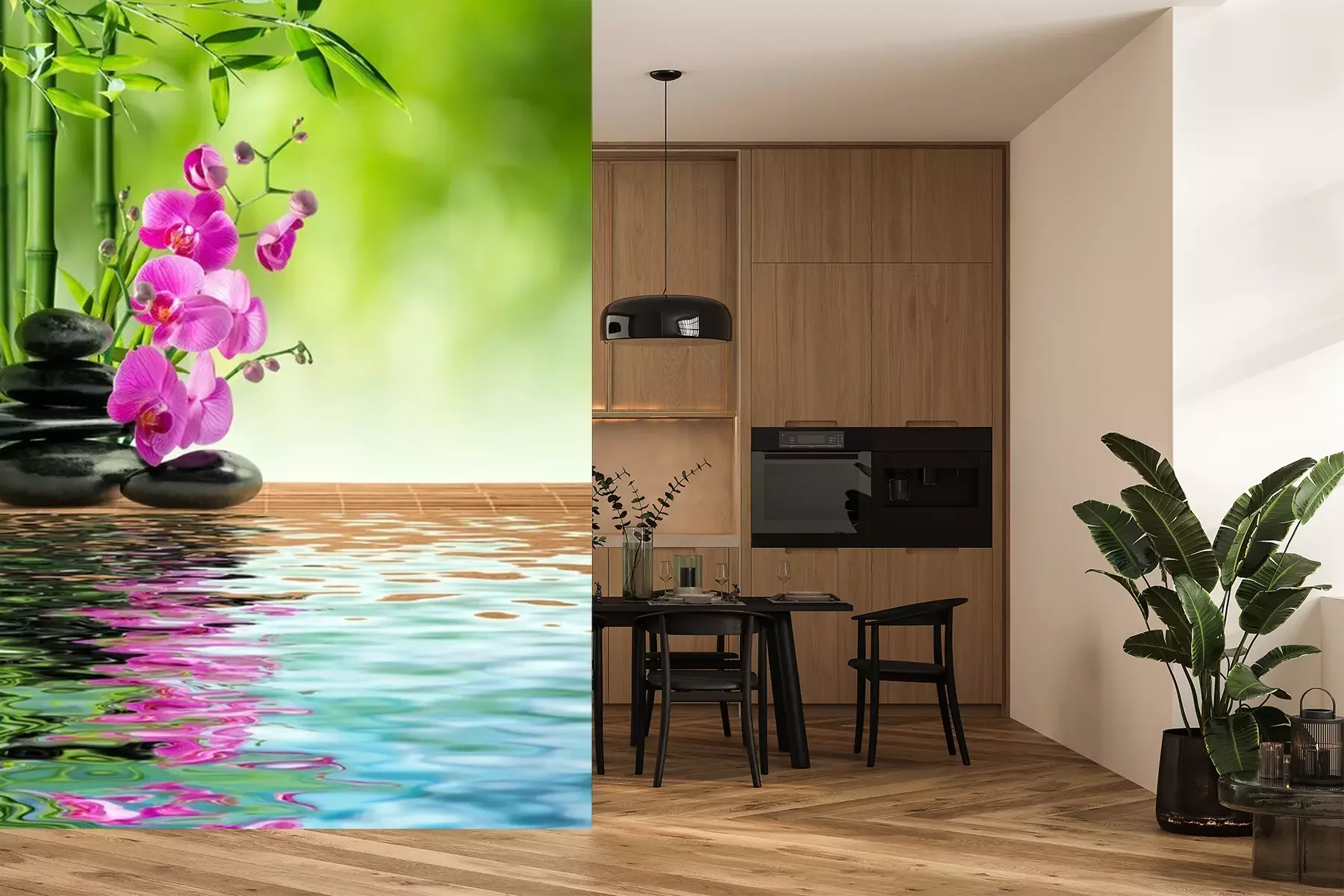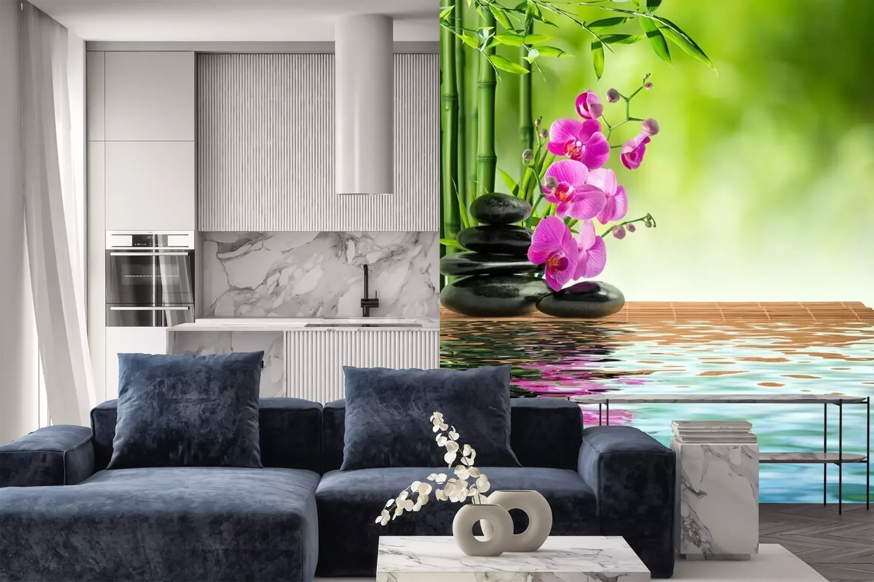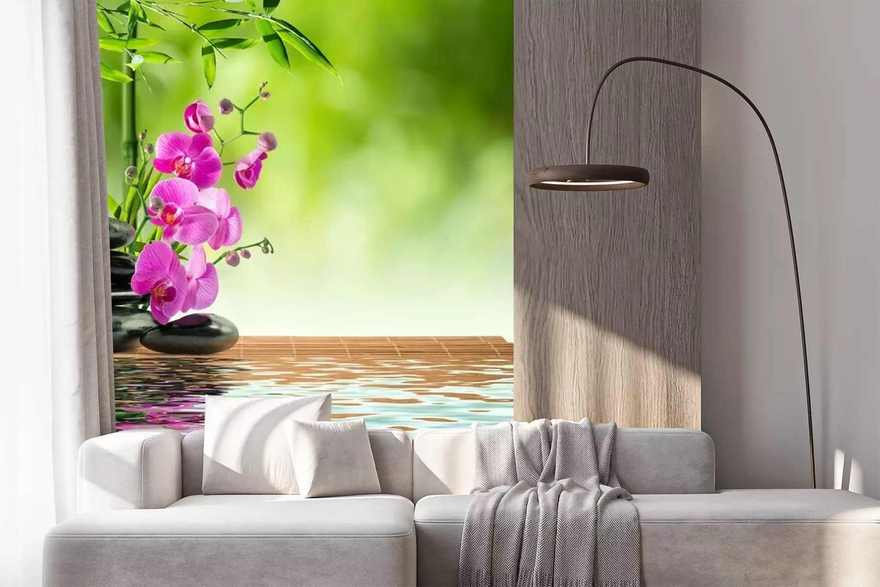 Orchidee samenstelling van stenen en bamboeFotobehang