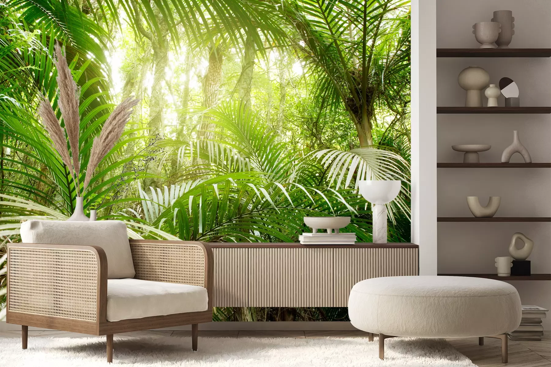 Het materiaal Premium+ is een gestructureerd vinyl op vlies met een gewicht van 255 g/m², dat kleine oneffenheden in de muur effectief camoufleert. De subtiele structuur van fijn zand geeft het oppervlak een exclusieve uitstraling, terwijl de halfmatte afwerking de diepte van de kleuren benadrukt. Het materiaal is dampdoorlatend, waardoor het ook in de keuken en badkamer kan worden gebruikt. De maximale breedte van één baan bedraagt 100 cm – bij grotere afmetingen wordt het fotobehang in meerdere gelijke banen verdeeld. De lijm wordt direct op de muur aangebracht en het behang wordt rand-aan-rand geplakt, wat zorgt voor een esthetisch resultaat zonder zichtbare naden. Het oppervlak kan gemakkelijk worden schoongemaakt door het voorzichtig af te nemen met een vochtige doek.