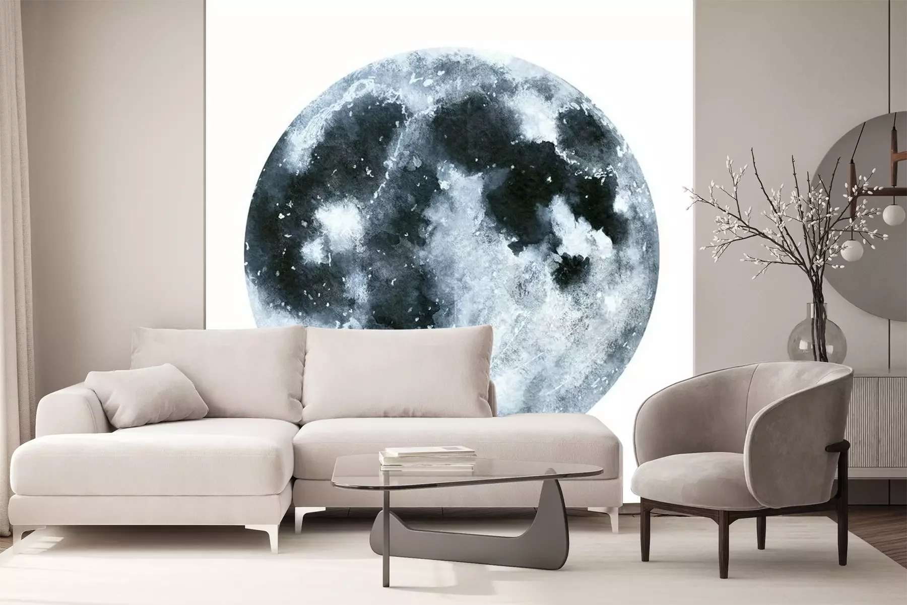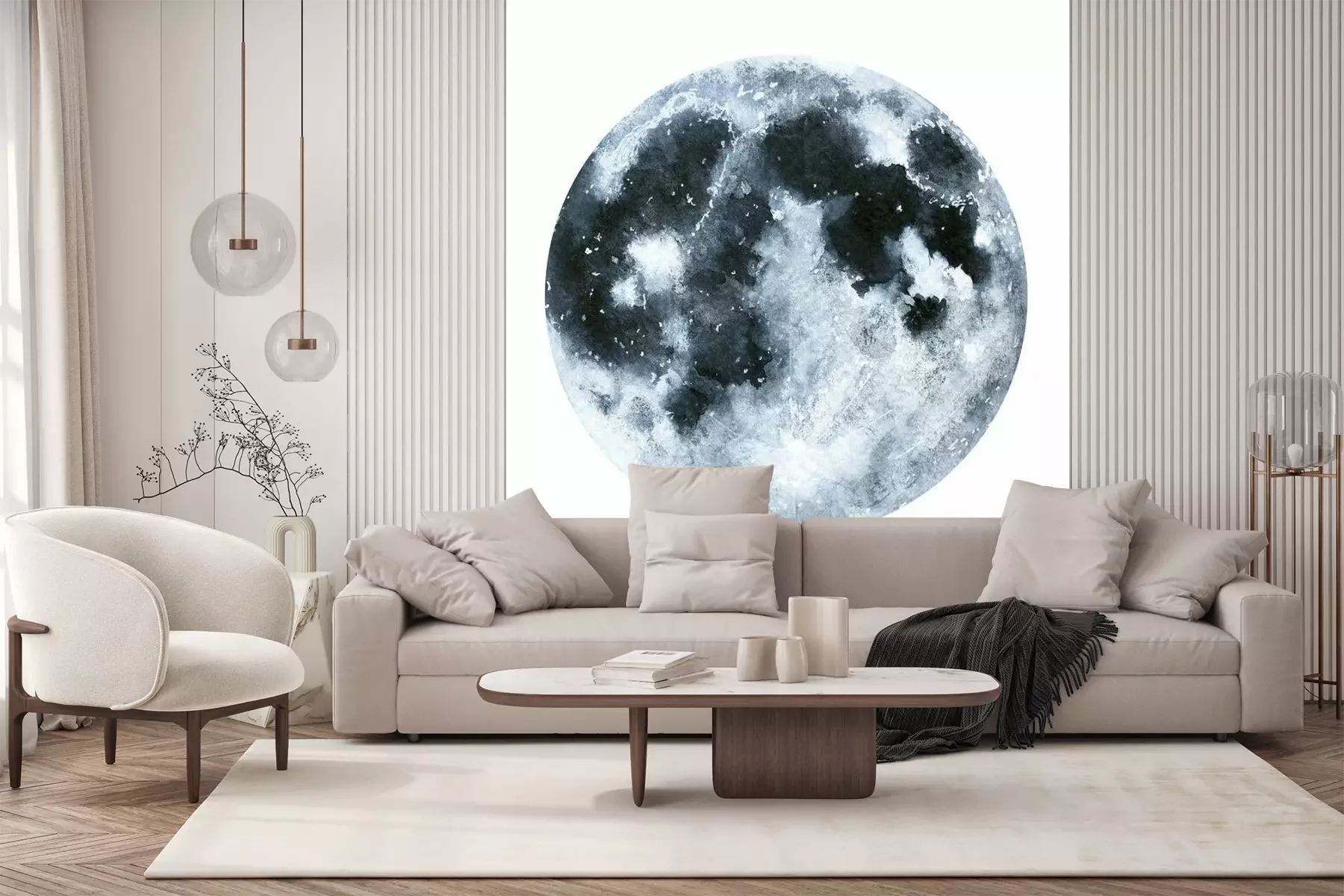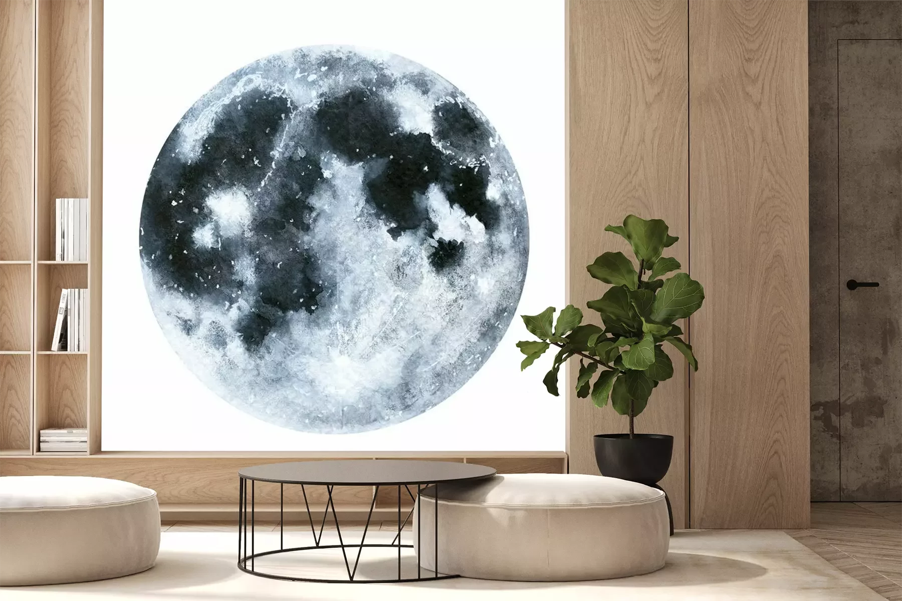 Fotobehang Grote aquarel maan illustratie. Symbool van nieuw begin, dromen, romantiek, fantasie, magie. Zwarte, grijze kleuren, cirkel, volledig zicht. Hand getrokken water kleur schilderij, geïsoleerd op een wi