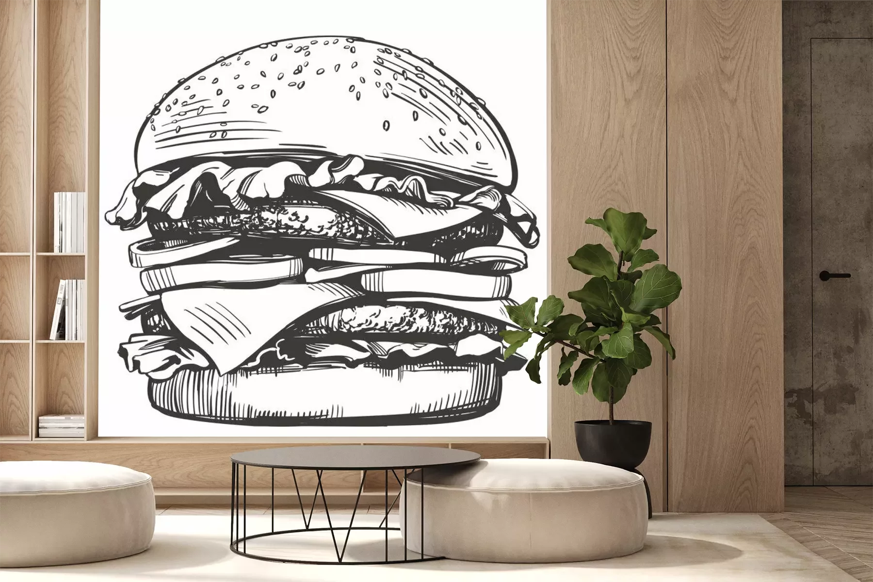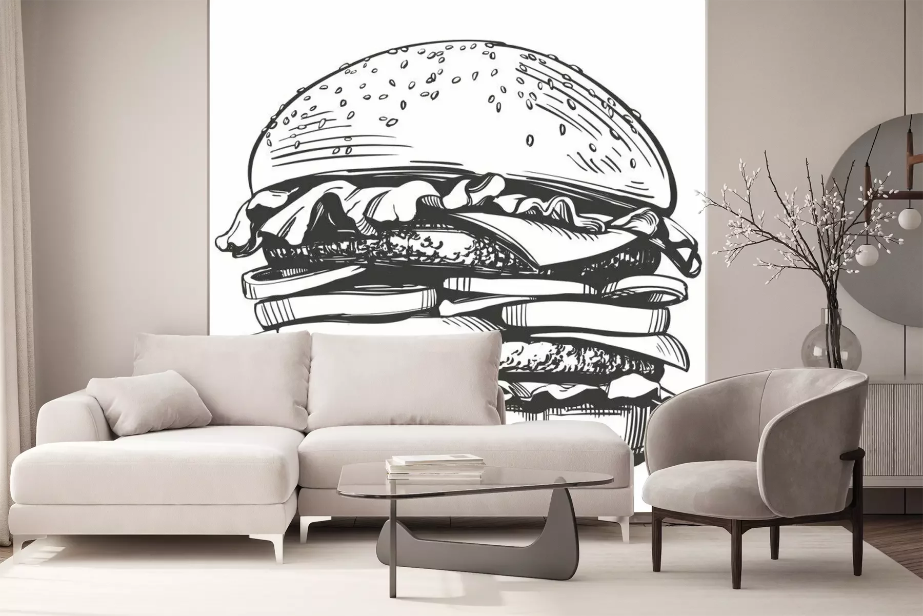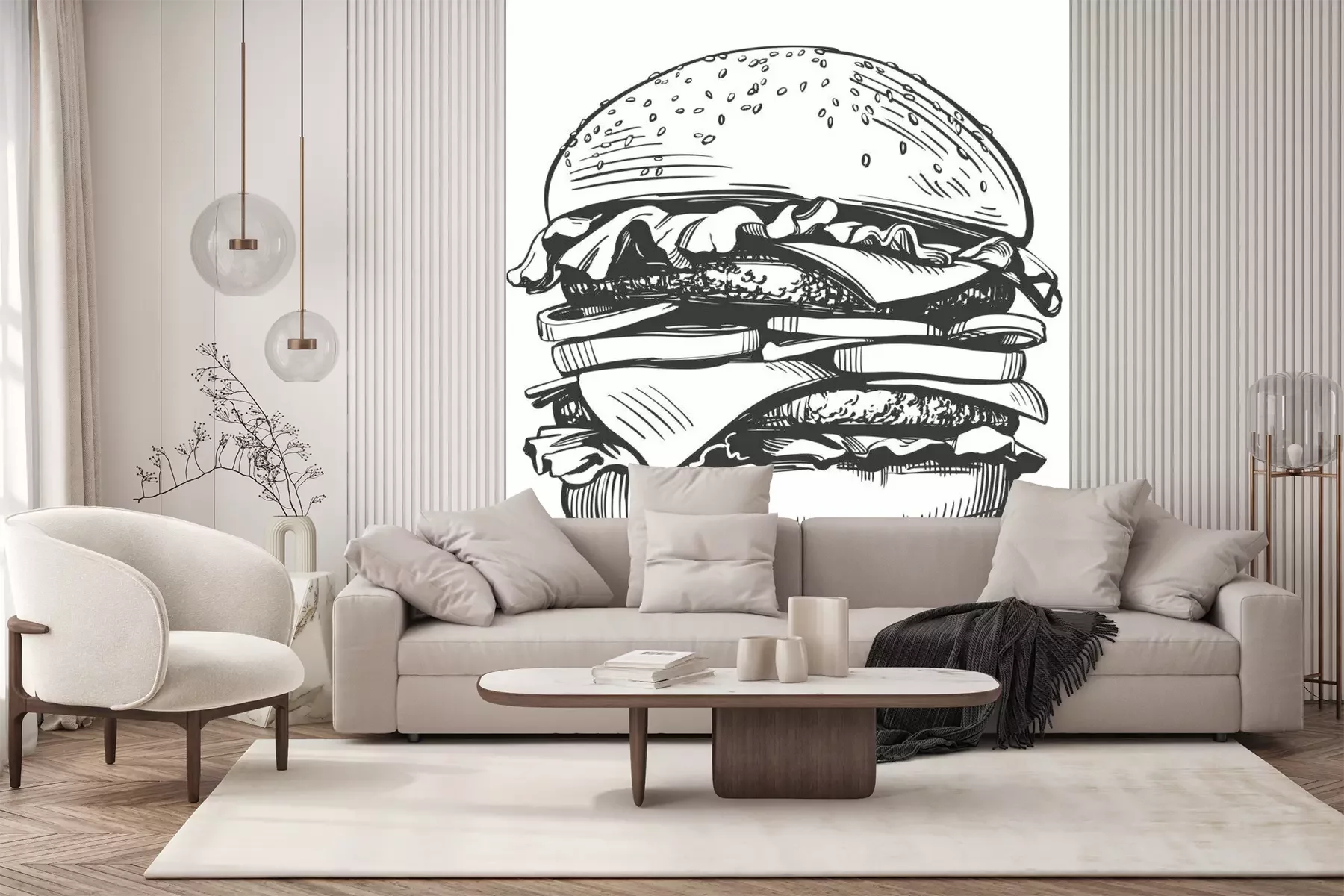 Fotobehang Grote hamburger, hamburger hand getrokken vector illustratie schets retro stijl