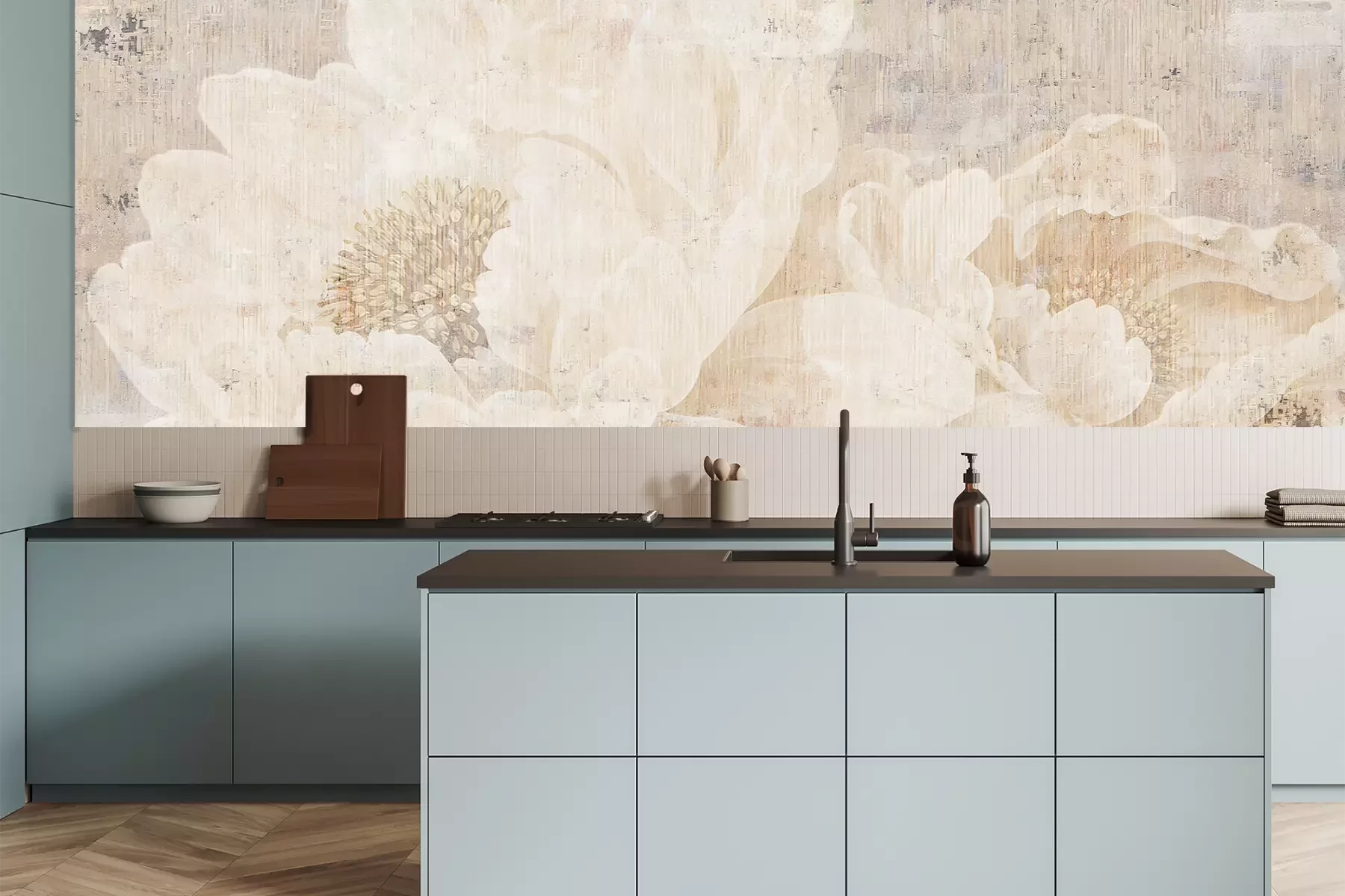 Het materiaal Premium is een glad vinyl op vlies, dat bestand is tegen uitrekken en vervorming. Het is dampdoorlatend – de muren kunnen vrij ademen – waardoor het geschikt is voor gebruik in de keuken en badkamer. Bij vervuiling kan het materiaal worden afgenomen met een vochtige doek. De maximale breedte van één baan bedraagt 95 of 105 cm, afhankelijk van de beschikbaarheid. Montage vindt plaats met de rand-aan-rand methode, wat een esthetisch resultaat zonder zichtbare naden oplevert. Omdat de lijm rechtstreeks op de muur wordt aangebracht, verloopt de installatie van het fotobehang snel en eenvoudig.