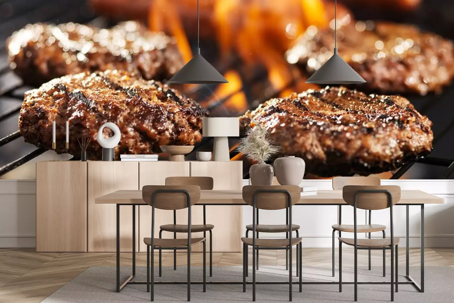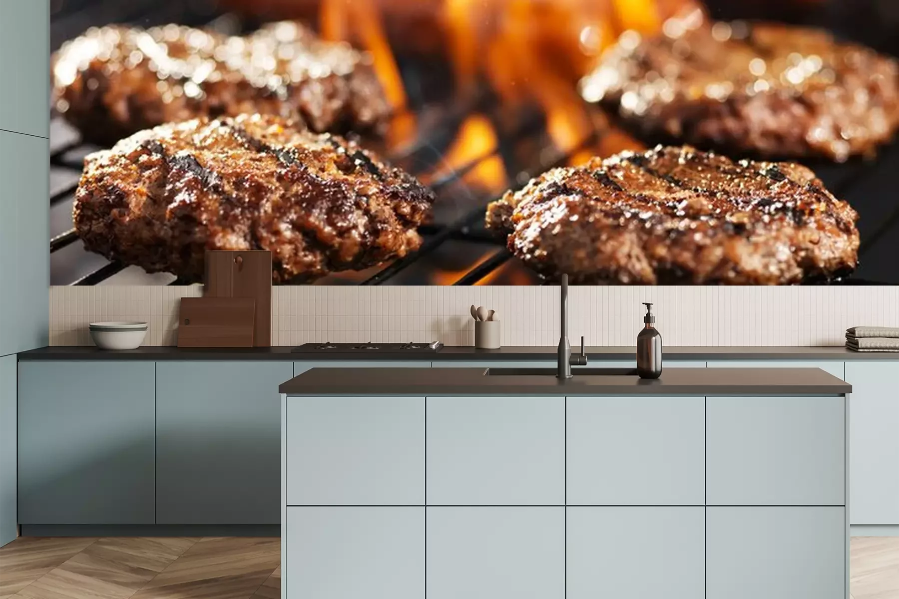 Fotobehang hamuburgers cooking on grill outdoors in panoramic composition