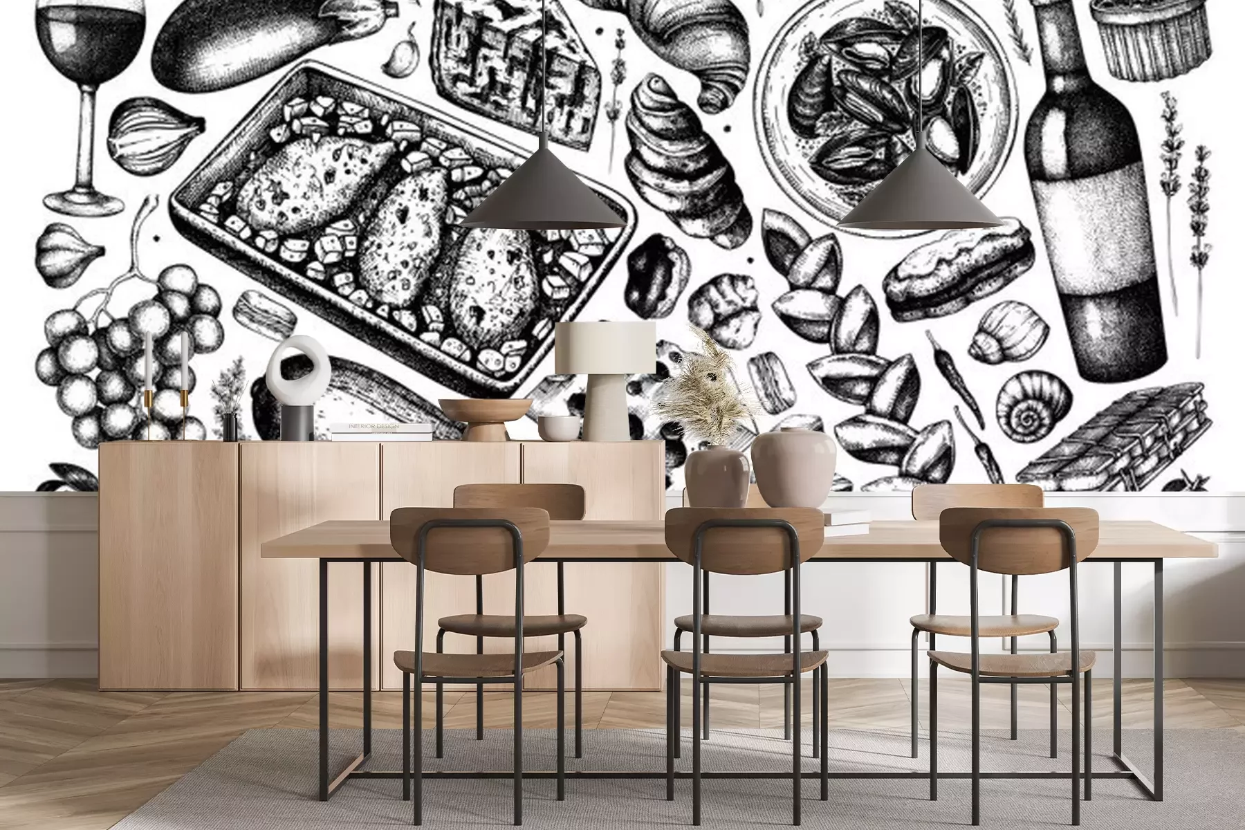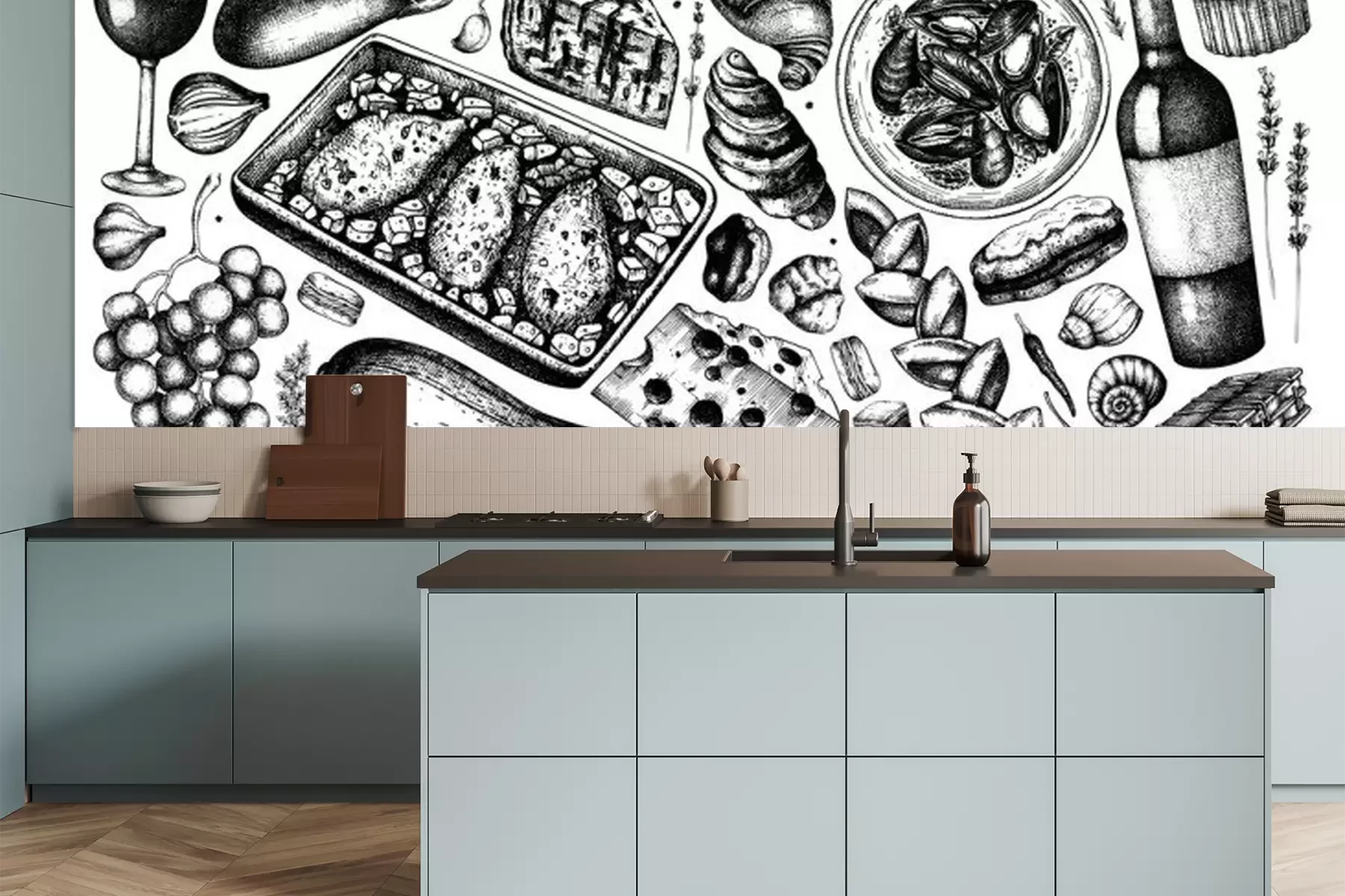 Fotobehang Hand drawn French food and drinks collection in color. Engraved style dishes, snacks, desserts, beverages sketches. French cuisine food illustrations.