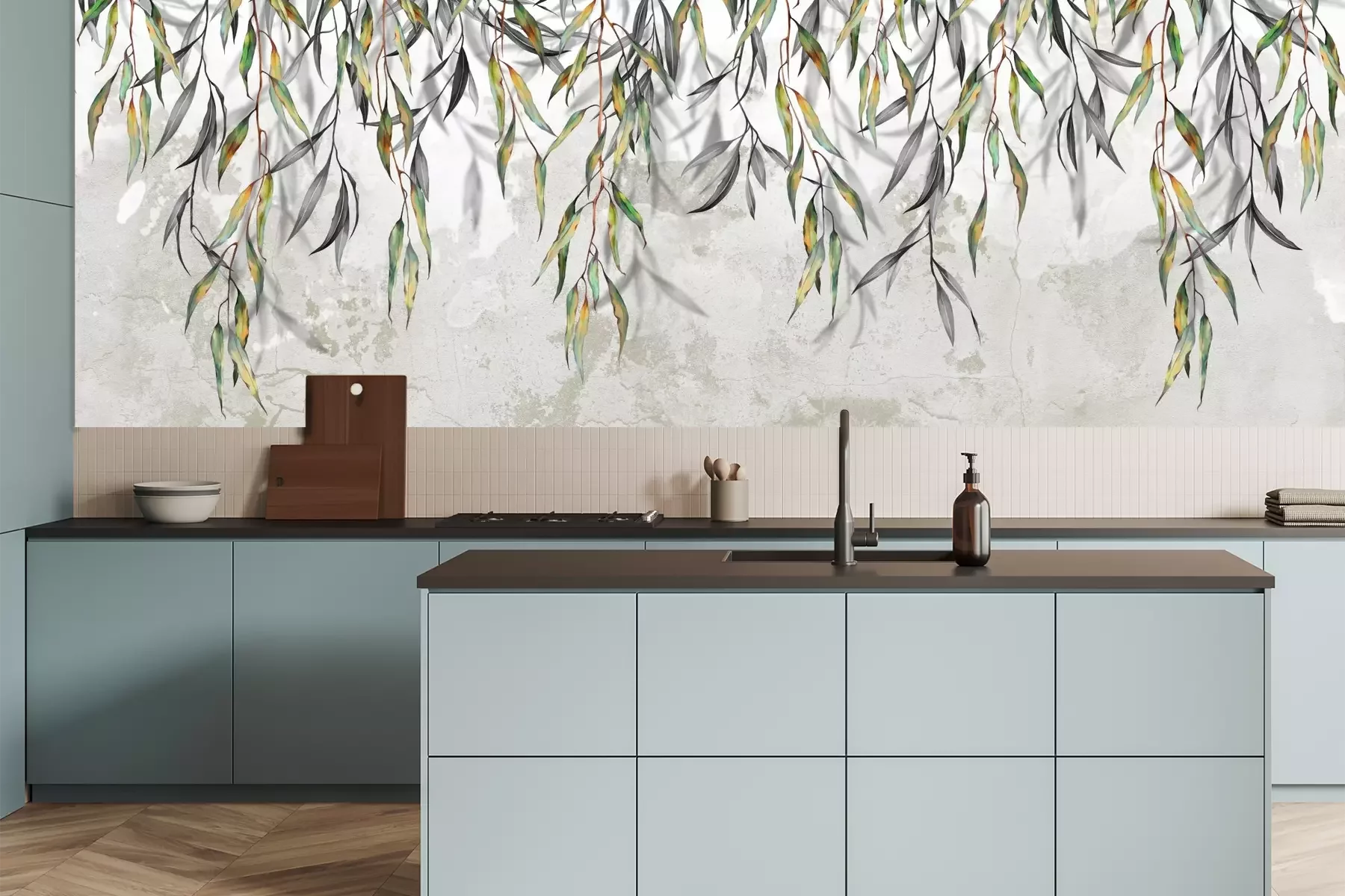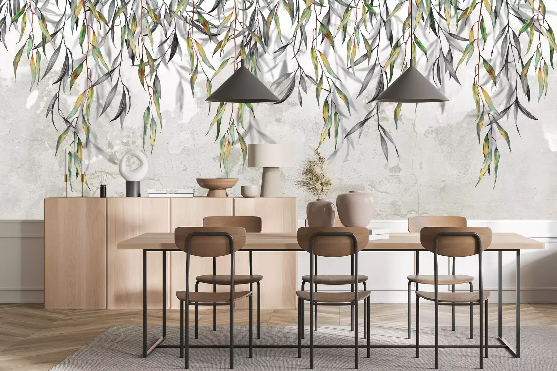 Hangende groene scheuten van een boom met bladeren