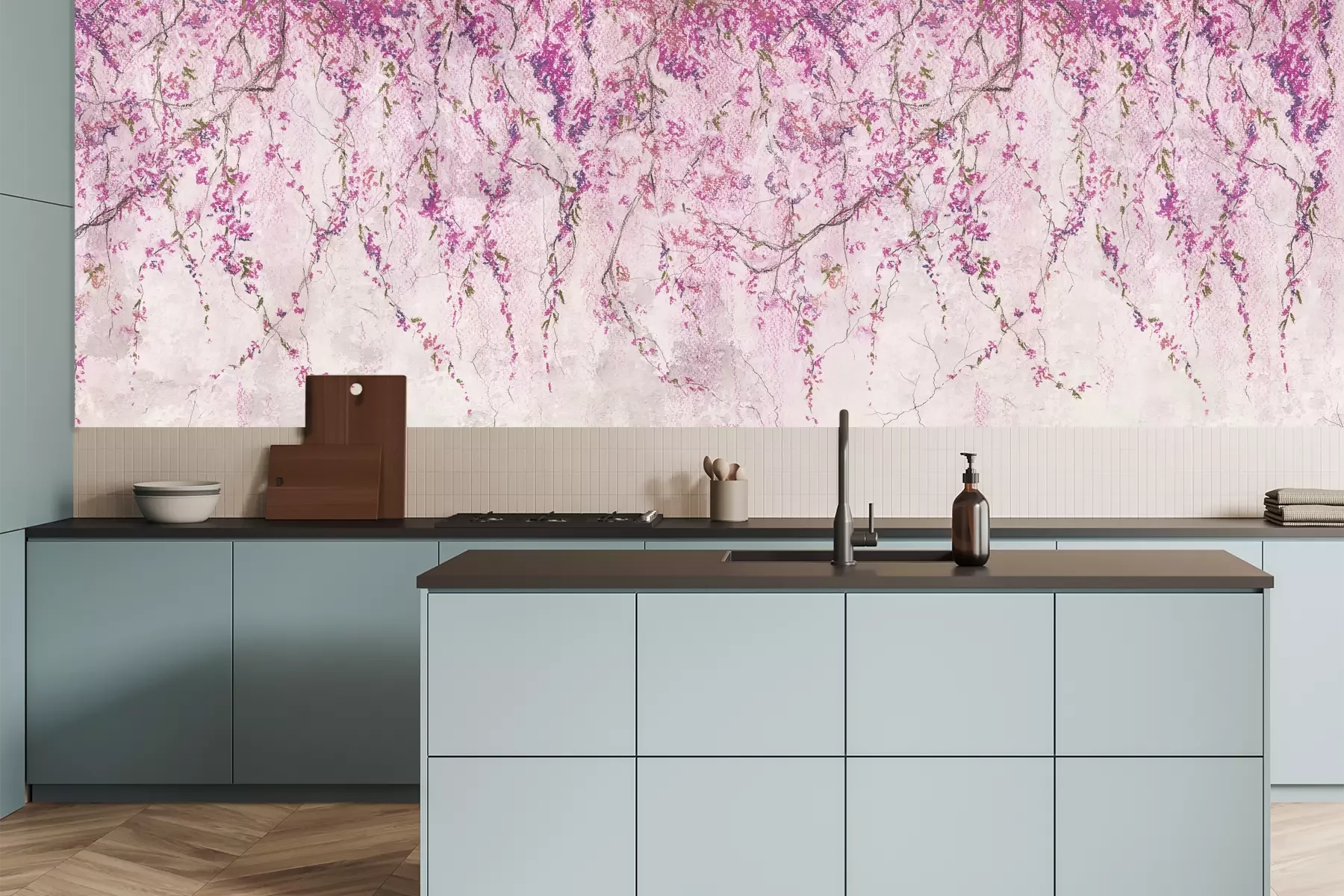 Het materiaal Premium is een glad vinyl op vlies, dat bestand is tegen uitrekken en vervorming. Het is dampdoorlatend – de muren kunnen vrij ademen – waardoor het geschikt is voor gebruik in de keuken en badkamer. Bij vervuiling kan het materiaal worden afgenomen met een vochtige doek. De maximale breedte van één baan bedraagt 95 of 105 cm, afhankelijk van de beschikbaarheid. Montage vindt plaats met de rand-aan-rand methode, wat een esthetisch resultaat zonder zichtbare naden oplevert. Omdat de lijm rechtstreeks op de muur wordt aangebracht, verloopt de installatie van het fotobehang snel en eenvoudig.