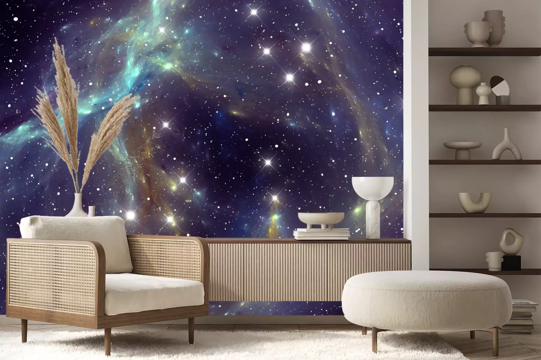 Het materiaal Premium+ is een gestructureerd vinyl op vlies met een gewicht van 255 g/m², dat kleine oneffenheden in de muur effectief camoufleert. De subtiele structuur van fijn zand geeft het oppervlak een exclusieve uitstraling, terwijl de halfmatte afwerking de diepte van de kleuren benadrukt. Het materiaal is dampdoorlatend, waardoor het ook in de keuken en badkamer kan worden gebruikt. De maximale breedte van één baan bedraagt 100 cm – bij grotere afmetingen wordt het fotobehang in meerdere gelijke banen verdeeld. De lijm wordt direct op de muur aangebracht en het behang wordt rand-aan-rand geplakt, wat zorgt voor een esthetisch resultaat zonder zichtbare naden. Het oppervlak kan gemakkelijk worden schoongemaakt door het voorzichtig af te nemen met een vochtige doek.