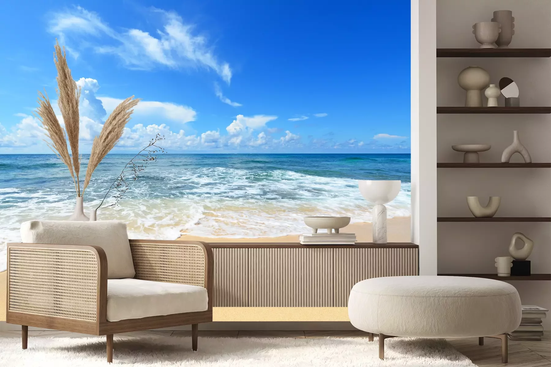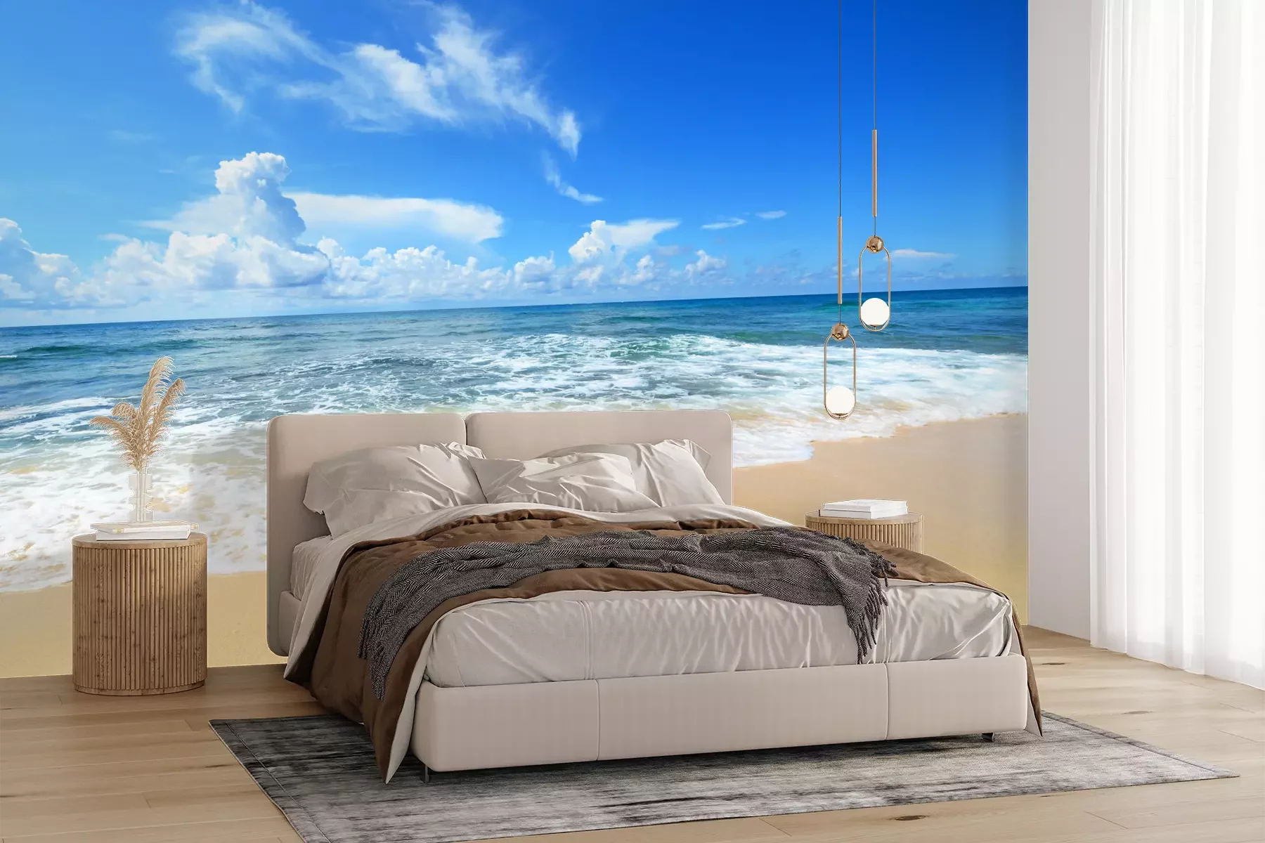 Het materiaal Premium+ is een gestructureerd vinyl op vlies met een gewicht van 255 g/m², dat kleine oneffenheden in de muur effectief camoufleert. De subtiele structuur van fijn zand geeft het oppervlak een exclusieve uitstraling, terwijl de halfmatte afwerking de diepte van de kleuren benadrukt. Het materiaal is dampdoorlatend, waardoor het ook in de keuken en badkamer kan worden gebruikt. De maximale breedte van één baan bedraagt 100 cm – bij grotere afmetingen wordt het fotobehang in meerdere gelijke banen verdeeld. De lijm wordt direct op de muur aangebracht en het behang wordt rand-aan-rand geplakt, wat zorgt voor een esthetisch resultaat zonder zichtbare naden. Het oppervlak kan gemakkelijk worden schoongemaakt door het voorzichtig af te nemen met een vochtige doek.