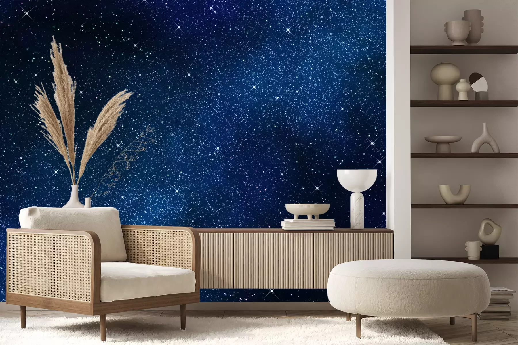 Het materiaal Premium+ is een gestructureerd vinyl op vlies met een gewicht van 255 g/m², dat kleine oneffenheden in de muur effectief camoufleert. De subtiele structuur van fijn zand geeft het oppervlak een exclusieve uitstraling, terwijl de halfmatte afwerking de diepte van de kleuren benadrukt. Het materiaal is dampdoorlatend, waardoor het ook in de keuken en badkamer kan worden gebruikt. De maximale breedte van één baan bedraagt 100 cm – bij grotere afmetingen wordt het fotobehang in meerdere gelijke banen verdeeld. De lijm wordt direct op de muur aangebracht en het behang wordt rand-aan-rand geplakt, wat zorgt voor een esthetisch resultaat zonder zichtbare naden. Het oppervlak kan gemakkelijk worden schoongemaakt door het voorzichtig af te nemen met een vochtige doek.