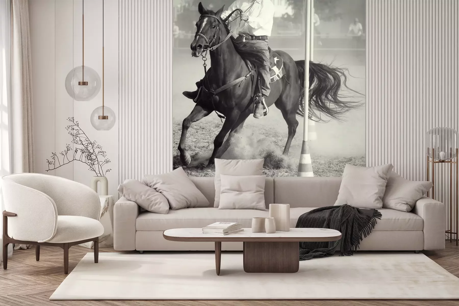 Het materiaal Premium+ is een gestructureerd vinyl op vlies met een gewicht van 255 g/m², dat kleine oneffenheden in de muur effectief camoufleert. De subtiele structuur van fijn zand geeft het oppervlak een exclusieve uitstraling, terwijl de halfmatte afwerking de diepte van de kleuren benadrukt. Het materiaal is dampdoorlatend, waardoor het ook in de keuken en badkamer kan worden gebruikt. De maximale breedte van één baan bedraagt 100 cm – bij grotere afmetingen wordt het fotobehang in meerdere gelijke banen verdeeld. De lijm wordt direct op de muur aangebracht en het behang wordt rand-aan-rand geplakt, wat zorgt voor een esthetisch resultaat zonder zichtbare naden. Het oppervlak kan gemakkelijk worden schoongemaakt door het voorzichtig af te nemen met een vochtige doek.