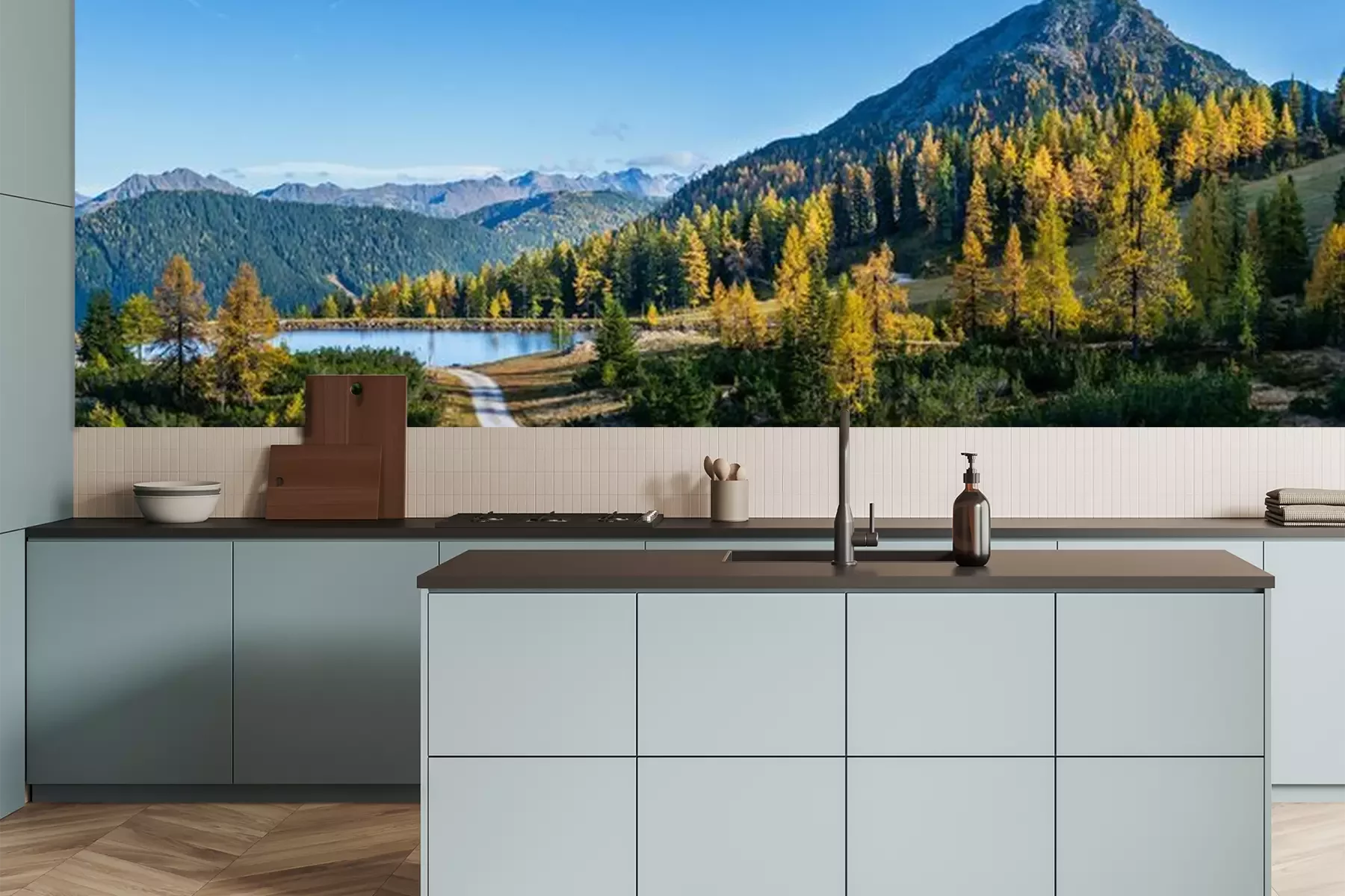 Het materiaal Premium is een glad vinyl op vlies, dat bestand is tegen uitrekken en vervorming. Het is dampdoorlatend – de muren kunnen vrij ademen – waardoor het geschikt is voor gebruik in de keuken en badkamer. Bij vervuiling kan het materiaal worden afgenomen met een vochtige doek. De maximale breedte van één baan bedraagt 95 of 105 cm, afhankelijk van de beschikbaarheid. Montage vindt plaats met de rand-aan-rand methode, wat een esthetisch resultaat zonder zichtbare naden oplevert. Omdat de lijm rechtstreeks op de muur wordt aangebracht, verloopt de installatie van het fotobehang snel en eenvoudig.