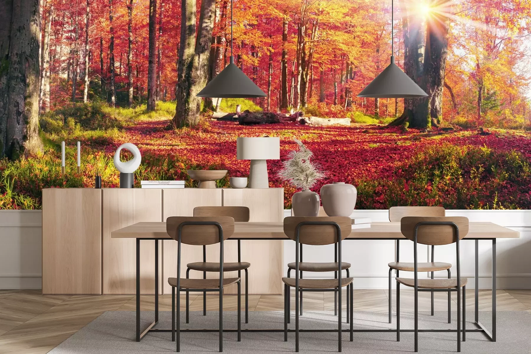 Het materiaal Premium+ is een gestructureerd vinyl op vlies met een gewicht van 255 g/m², dat kleine oneffenheden in de muur effectief camoufleert. De subtiele structuur van fijn zand geeft het oppervlak een exclusieve uitstraling, terwijl de halfmatte afwerking de diepte van de kleuren benadrukt. Het materiaal is dampdoorlatend, waardoor het ook in de keuken en badkamer kan worden gebruikt. De maximale breedte van één baan bedraagt 100 cm – bij grotere afmetingen wordt het fotobehang in meerdere gelijke banen verdeeld. De lijm wordt direct op de muur aangebracht en het behang wordt rand-aan-rand geplakt, wat zorgt voor een esthetisch resultaat zonder zichtbare naden. Het oppervlak kan gemakkelijk worden schoongemaakt door het voorzichtig af te nemen met een vochtige doek.
