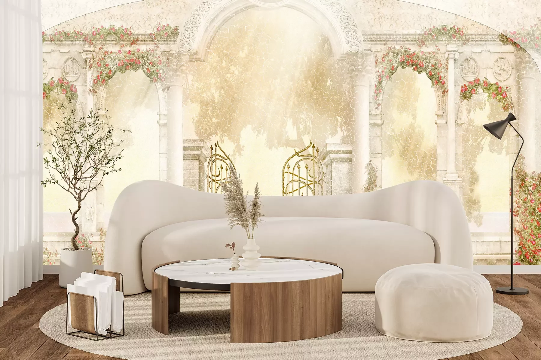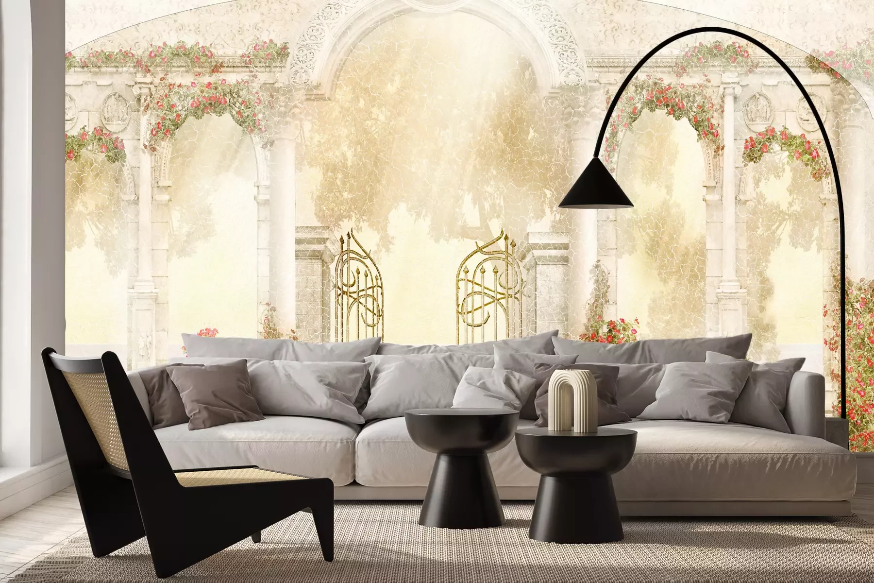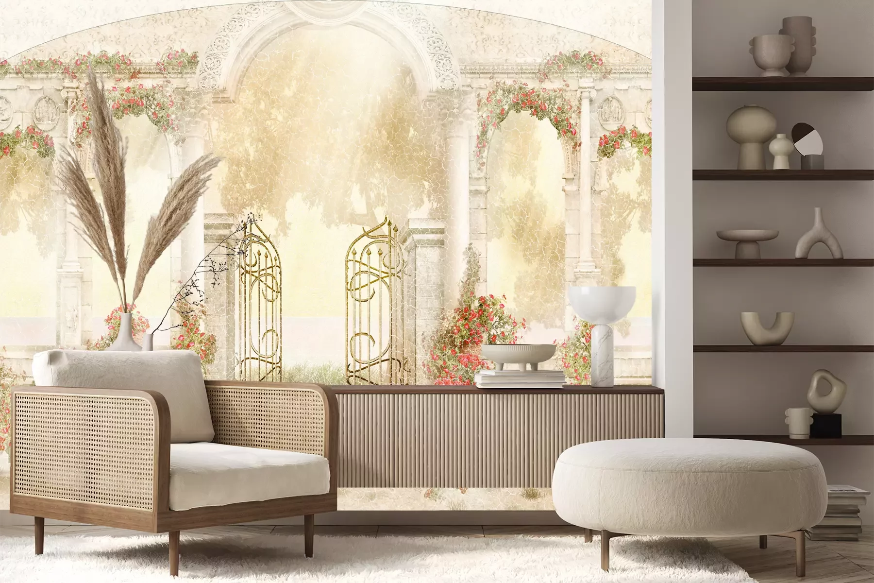 Het materiaal Premium+ is een gestructureerd vinyl op vlies met een gewicht van 255 g/m², dat kleine oneffenheden in de muur effectief camoufleert. De subtiele structuur van fijn zand geeft het oppervlak een exclusieve uitstraling, terwijl de halfmatte afwerking de diepte van de kleuren benadrukt. Het materiaal is dampdoorlatend, waardoor het ook in de keuken en badkamer kan worden gebruikt. De maximale breedte van één baan bedraagt 100 cm – bij grotere afmetingen wordt het fotobehang in meerdere gelijke banen verdeeld. De lijm wordt direct op de muur aangebracht en het behang wordt rand-aan-rand geplakt, wat zorgt voor een esthetisch resultaat zonder zichtbare naden. Het oppervlak kan gemakkelijk worden schoongemaakt door het voorzichtig af te nemen met een vochtige doek.