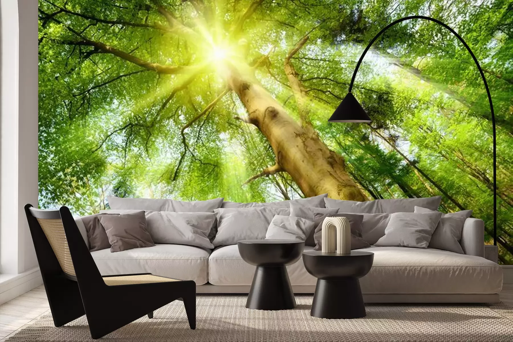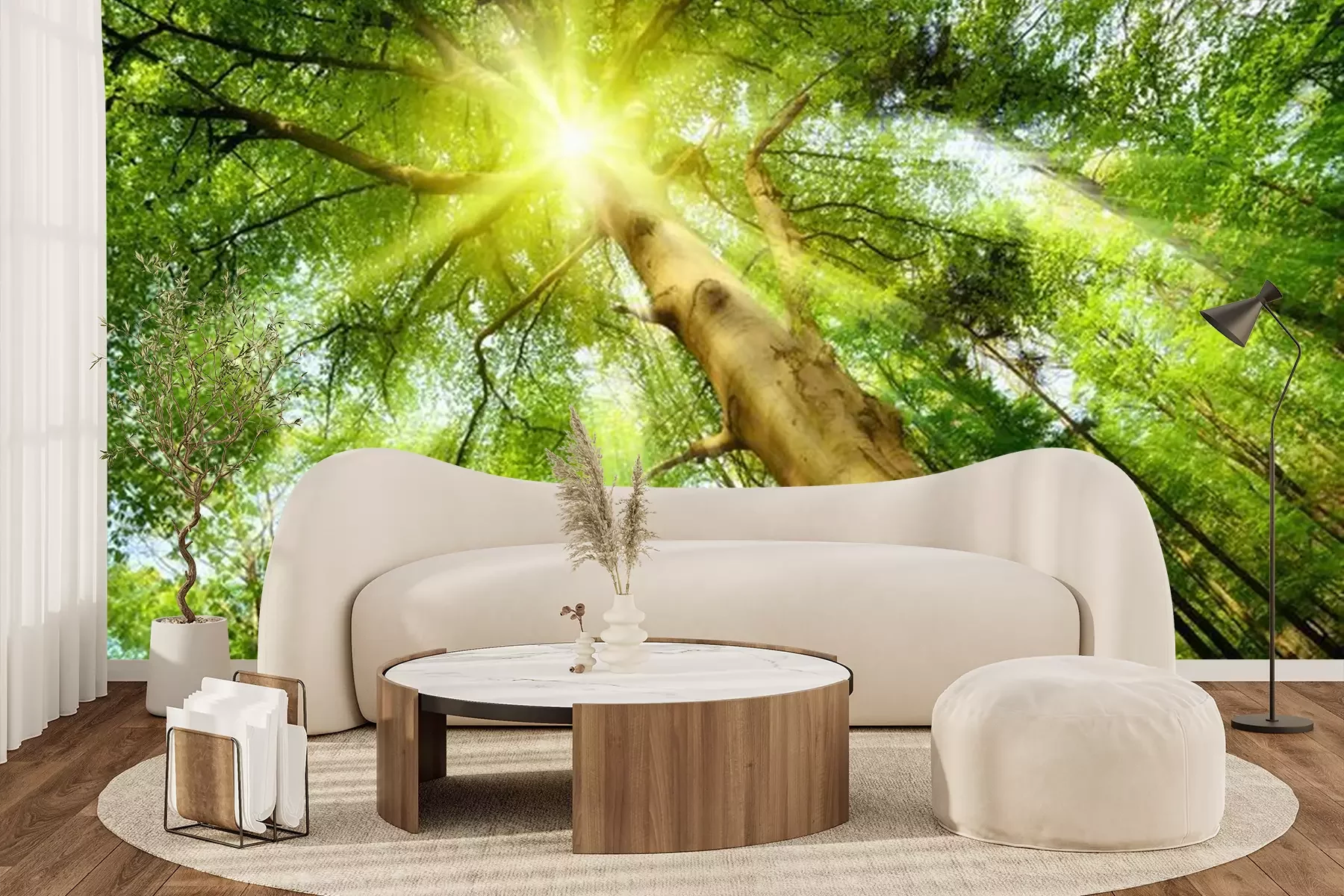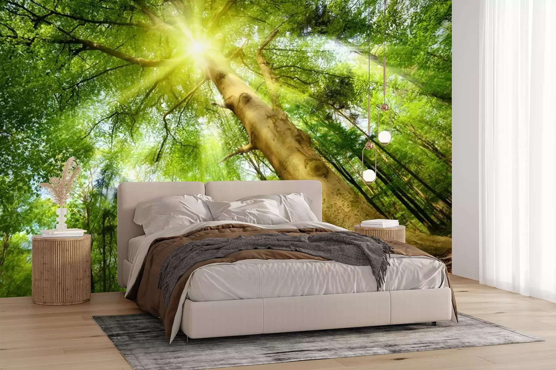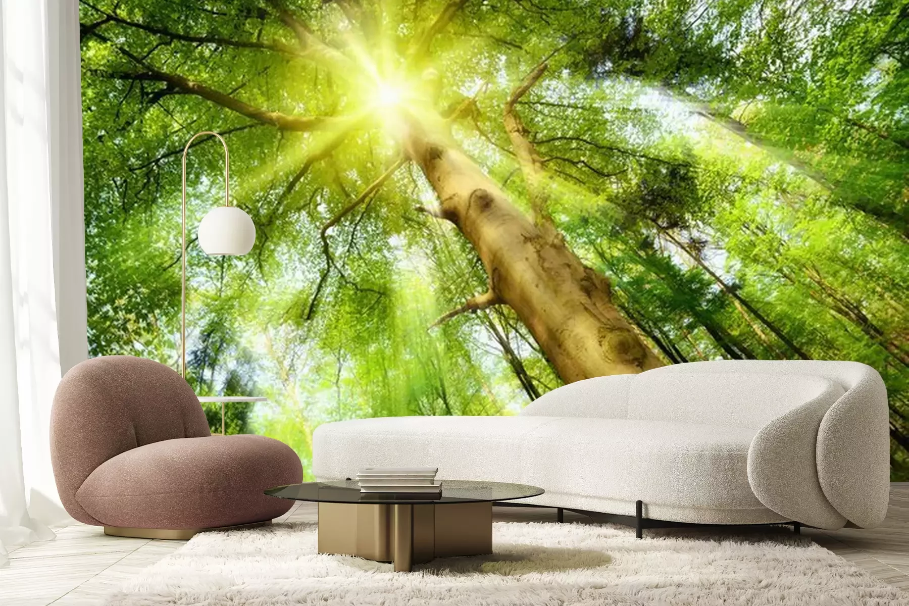 Een boom met een kroon in de zonnestralenFotobehang