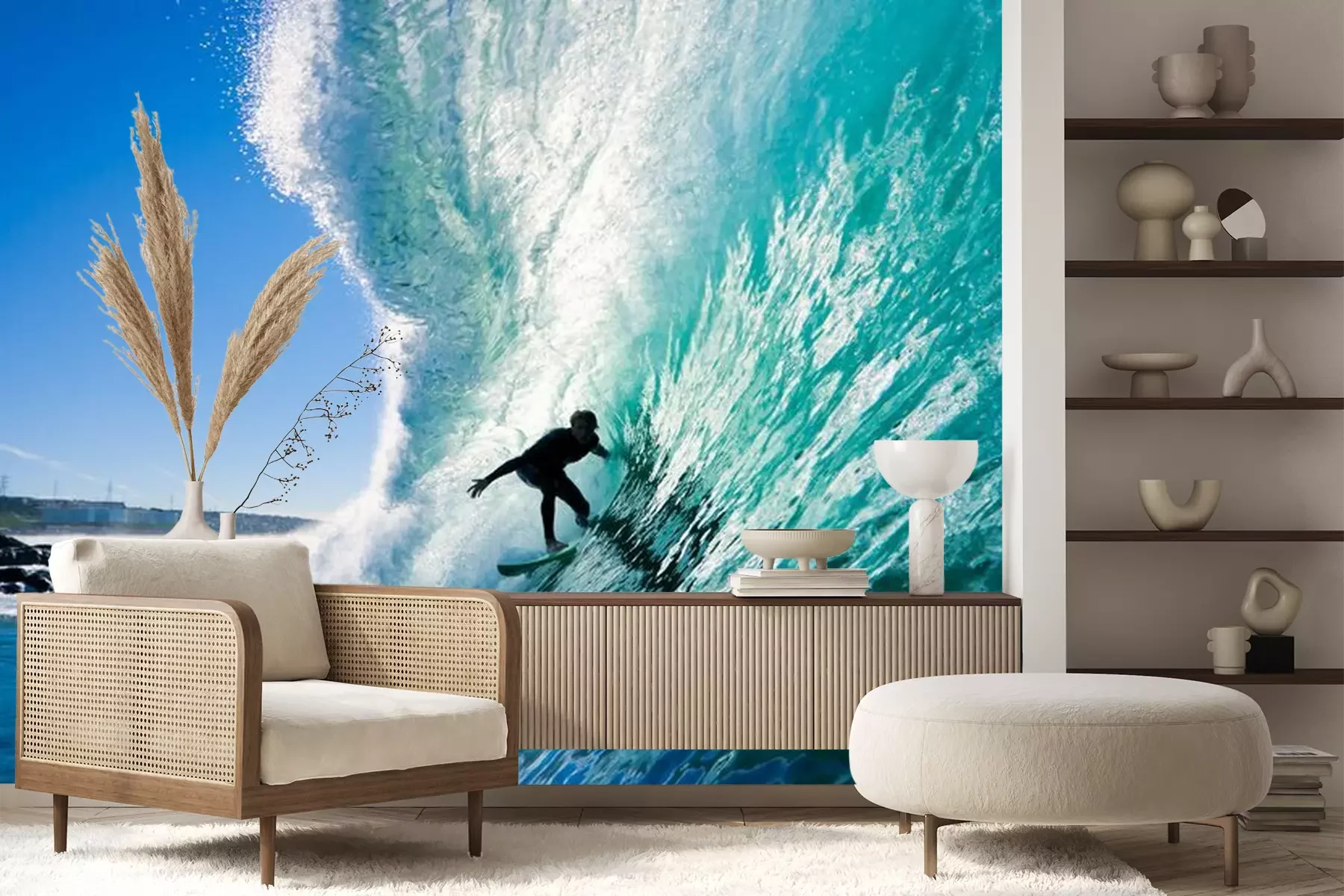 Het materiaal Premium+ is een gestructureerd vinyl op vlies met een gewicht van 255 g/m², dat kleine oneffenheden in de muur effectief camoufleert. De subtiele structuur van fijn zand geeft het oppervlak een exclusieve uitstraling, terwijl de halfmatte afwerking de diepte van de kleuren benadrukt. Het materiaal is dampdoorlatend, waardoor het ook in de keuken en badkamer kan worden gebruikt. De maximale breedte van één baan bedraagt 100 cm – bij grotere afmetingen wordt het fotobehang in meerdere gelijke banen verdeeld. De lijm wordt direct op de muur aangebracht en het behang wordt rand-aan-rand geplakt, wat zorgt voor een esthetisch resultaat zonder zichtbare naden. Het oppervlak kan gemakkelijk worden schoongemaakt door het voorzichtig af te nemen met een vochtige doek.