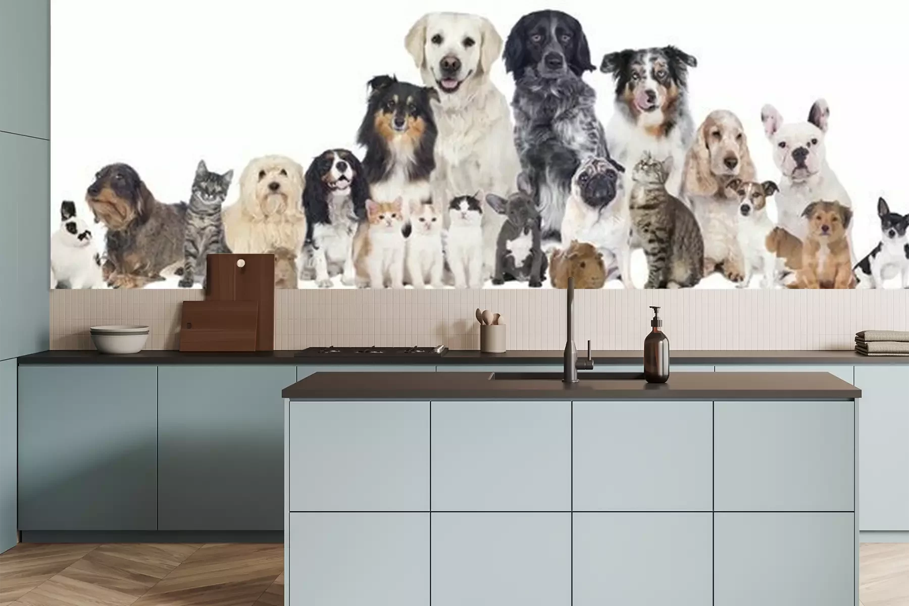 Het materiaal Premium is een glad vinyl op vlies, dat bestand is tegen uitrekken en vervorming. Het is dampdoorlatend – de muren kunnen vrij ademen – waardoor het geschikt is voor gebruik in de keuken en badkamer. Bij vervuiling kan het materiaal worden afgenomen met een vochtige doek. De maximale breedte van één baan bedraagt 95 of 105 cm, afhankelijk van de beschikbaarheid. Montage vindt plaats met de rand-aan-rand methode, wat een esthetisch resultaat zonder zichtbare naden oplevert. Omdat de lijm rechtstreeks op de muur wordt aangebracht, verloopt de installatie van het fotobehang snel en eenvoudig.