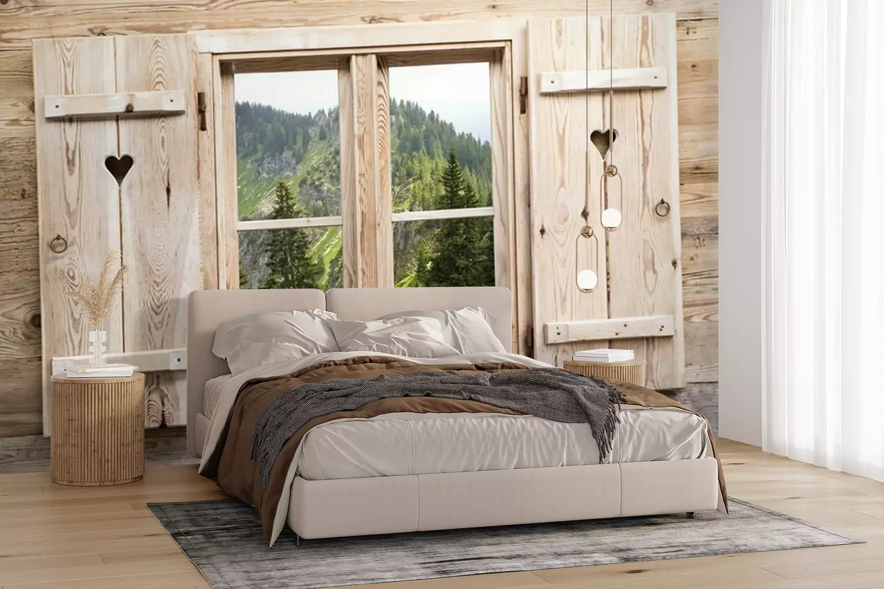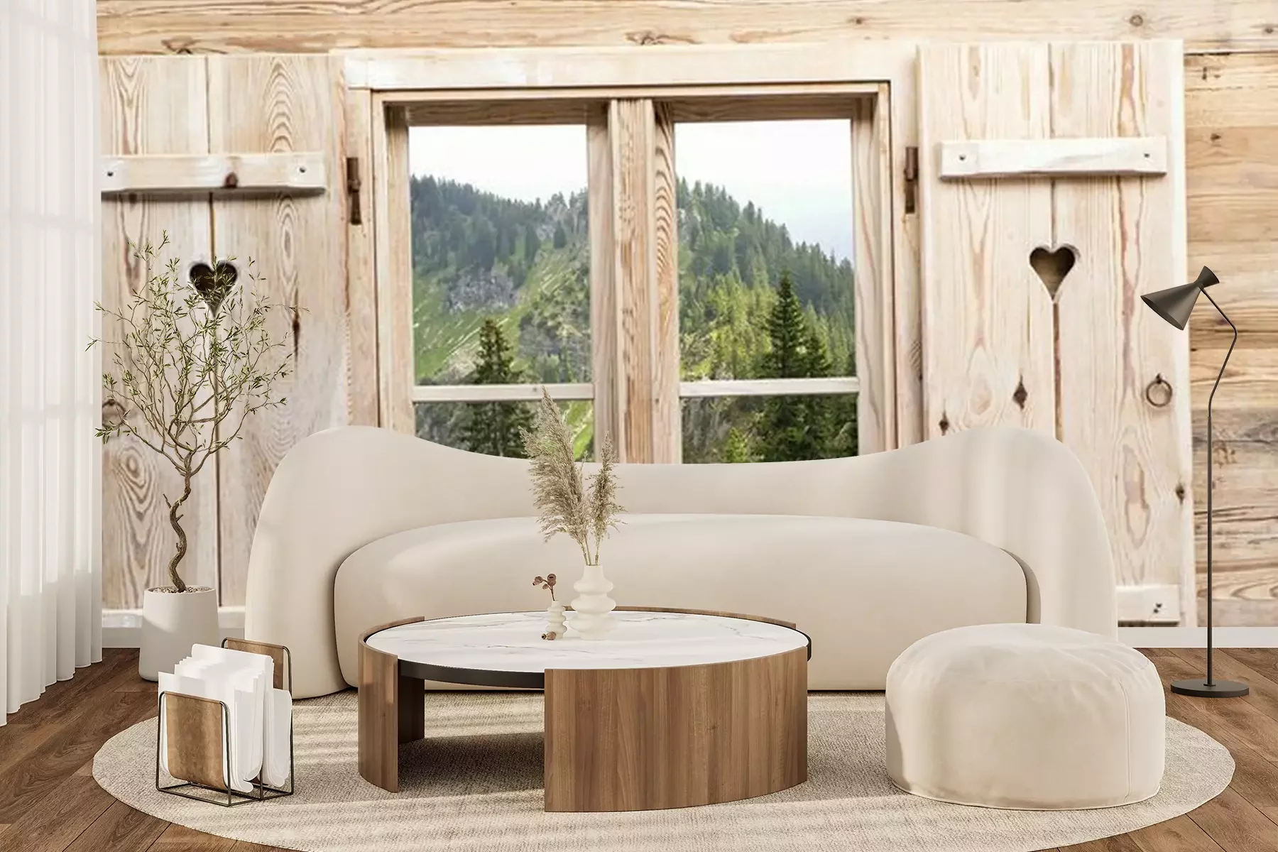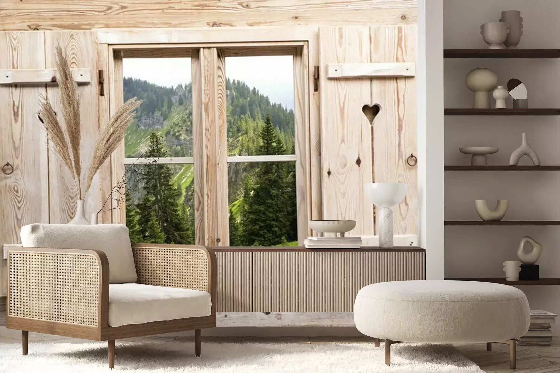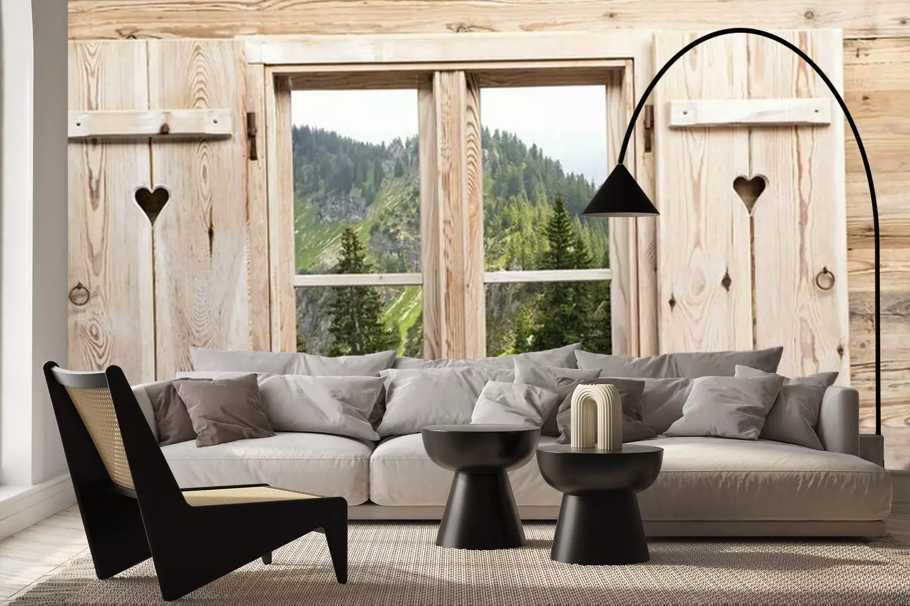 Houten raam met besneeuwde berg reflectiesProbleemloze bezorging verzorgd door vertrouwde vervoerders