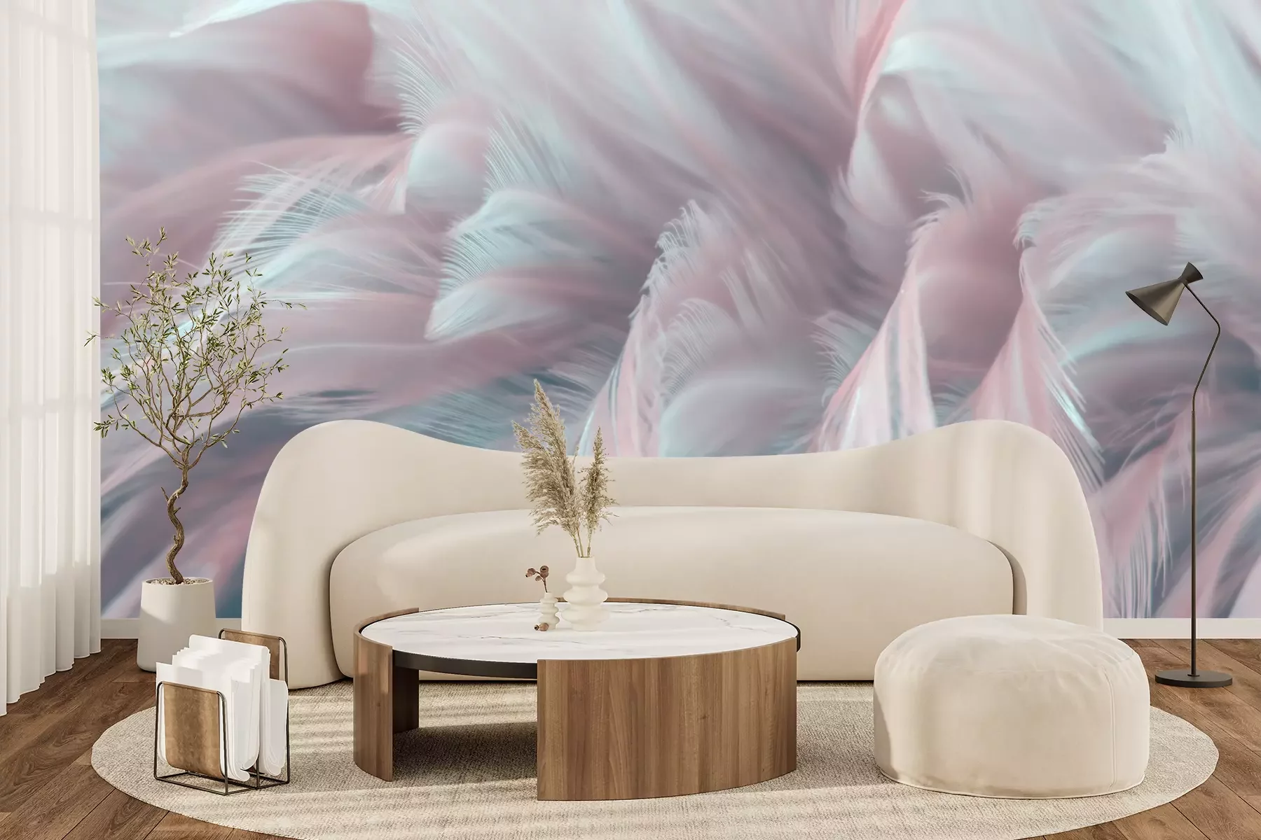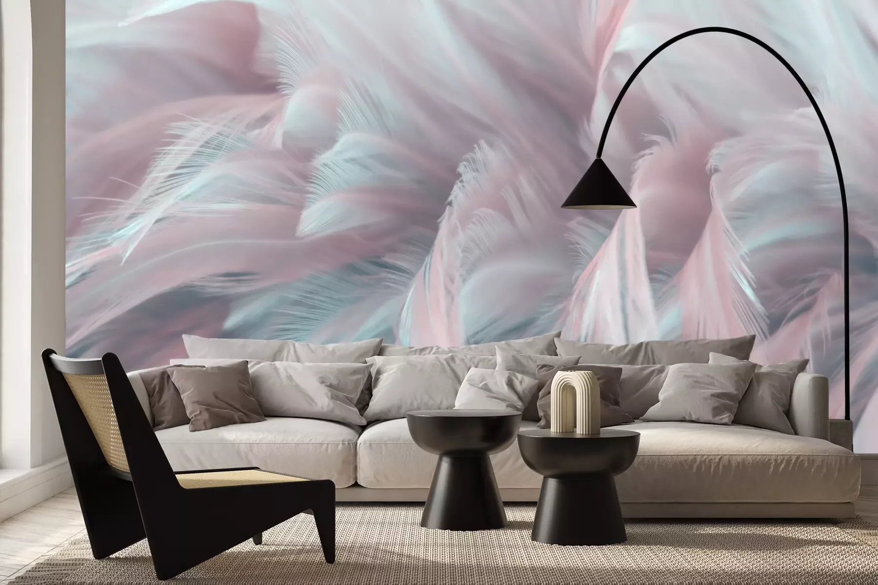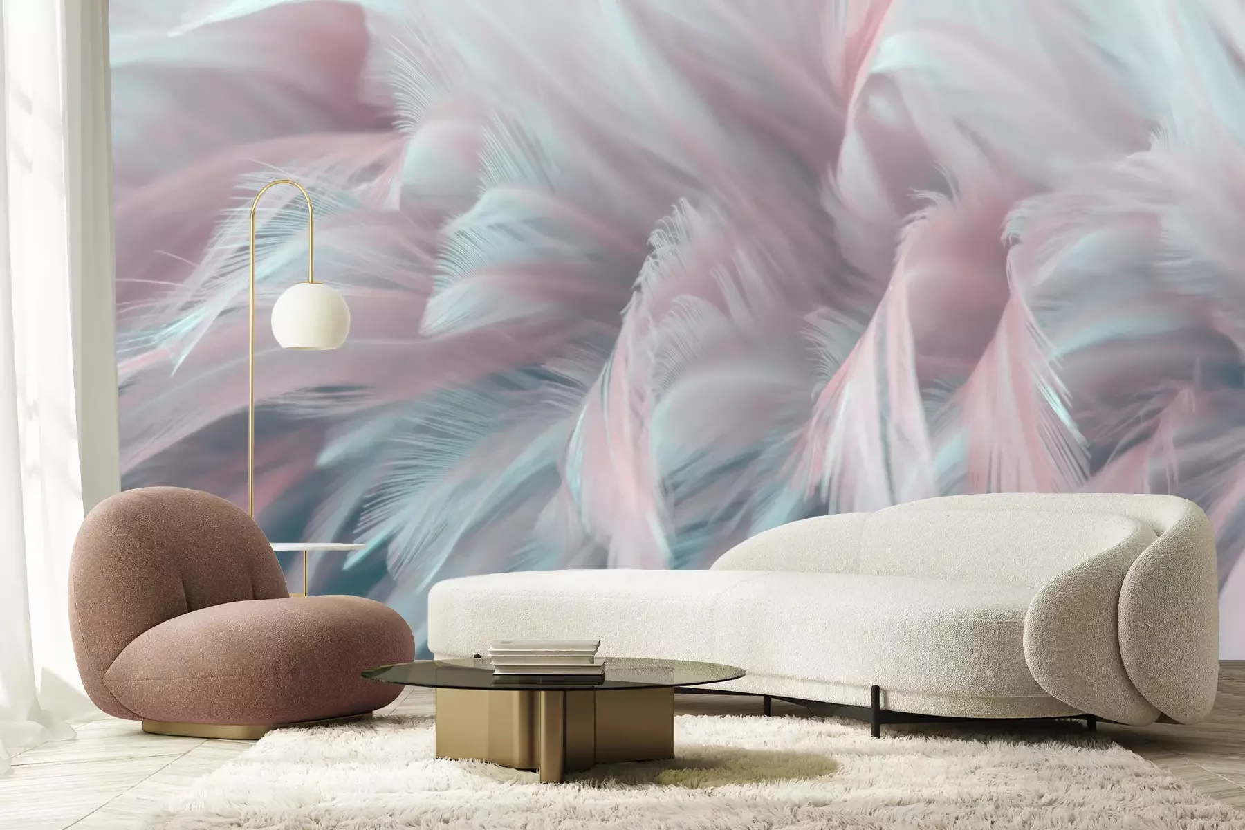 Een delicaat fotobehang met vogelveren is een bijzonder interessante decoratieve oplossing. Aan de ene kant is het patroon zeer subtiel, maar aan de andere kant trekt het onmiddellijk de aandacht en wordt het het dominante element van het interieur. Dit komt doordat dierlijke motieven, zelfs in een ingetogen kleurenschema, een extravagant karakter hebben. Ons geselecteerde pastel fotobehang maakt het mogelijk om in een oogwenk een verbluffende transformatie van je huiselijke sfeer te realiseren met minimale inspanning. De uitstekende printkwaliteit zorgt ervoor dat de vogelveren er uiterst realistisch uitzien. Dit optische effect geeft de ruimte een unieke uitstraling. Hun pluizige structuur voegt bovendien een gevoel van diepte toe aan de kamer, waardoor een kleine ruimte visueel wordt vergroot. Maar dat is niet het enige voordeel van dit fotobehang. Veren geven de inrichting een gevoel van lichtheid. Als er zware, solide meubels in de kamer staan, kun je met dit ontwerp de uitstraling van het interieur veranderen. De combinatie van pastel roze en blauw past zowel bij een koel als een warm kleurenpalet. Hierdoor zal het delicaat fotobehang prachtig staan in een shabby chic-stijl met witgekalkte meubels, maar ook in een eclectisch interieur met houten elementen. In welke ruimtes komt ons bijzonder fotobehang goed tot zijn recht? Pastelveren zijn het perfecte decoratieve motief voor de slaapkamer, omdat de inrichting daardoor een subtiele en romantische sfeer krijgt die bevorderlijk is voor ontspanning. Het patroon kan een hele muur bedekken, maar het zal ook schitteren in combinatie met lamellen, lambrisering of houten wandpanelen. Een andere ruimte die het vermelden waard is, is de badkamer, waar dit fotobehang perfect past. Veren zorgen ervoor dat de inrichting veel gezelliger wordt en de ruimte een gevoel geeft van omhuld te zijn door iets zachts en pluizigs.