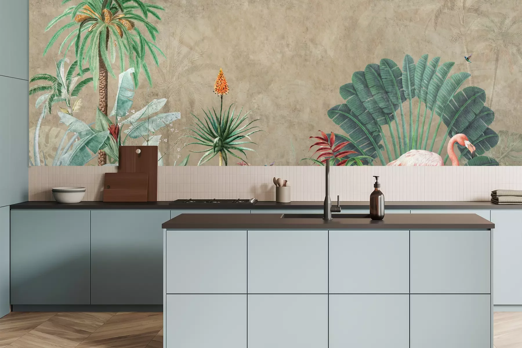 Het materiaal Premium is een glad vinyl op vlies, dat bestand is tegen uitrekken en vervorming. Het is dampdoorlatend – de muren kunnen vrij ademen – waardoor het geschikt is voor gebruik in de keuken en badkamer. Bij vervuiling kan het materiaal worden afgenomen met een vochtige doek. De maximale breedte van één baan bedraagt 95 of 105 cm, afhankelijk van de beschikbaarheid. Montage vindt plaats met de rand-aan-rand methode, wat een esthetisch resultaat zonder zichtbare naden oplevert. Omdat de lijm rechtstreeks op de muur wordt aangebracht, verloopt de installatie van het fotobehang snel en eenvoudig.