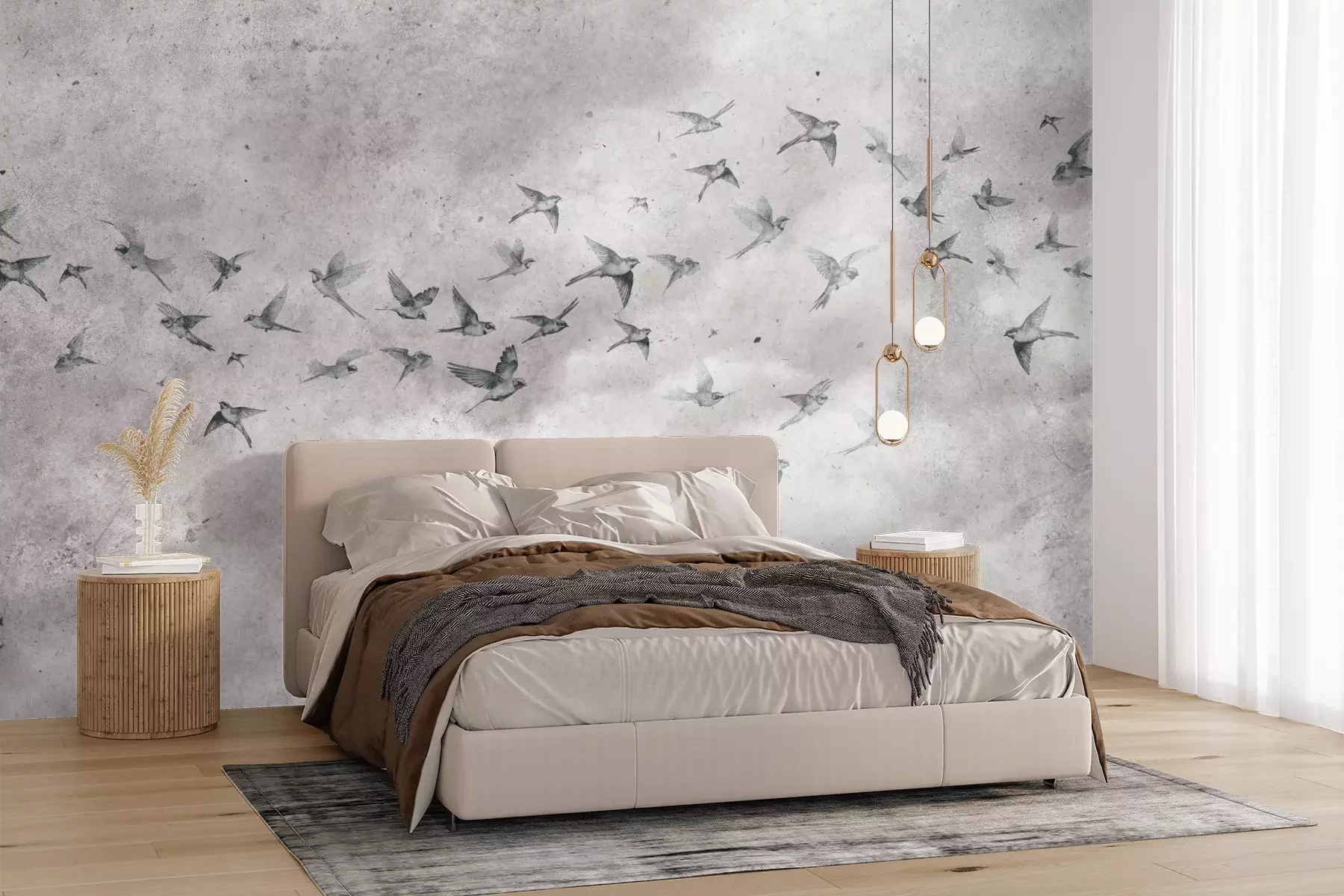 Het materiaal Premium+ is een gestructureerd vinyl op vlies met een gewicht van 255 g/m², dat kleine oneffenheden in de muur effectief camoufleert. De subtiele structuur van fijn zand geeft het oppervlak een exclusieve uitstraling, terwijl de halfmatte afwerking de diepte van de kleuren benadrukt. Het materiaal is dampdoorlatend, waardoor het ook in de keuken en badkamer kan worden gebruikt. De maximale breedte van één baan bedraagt 100 cm – bij grotere afmetingen wordt het fotobehang in meerdere gelijke banen verdeeld. De lijm wordt direct op de muur aangebracht en het behang wordt rand-aan-rand geplakt, wat zorgt voor een esthetisch resultaat zonder zichtbare naden. Het oppervlak kan gemakkelijk worden schoongemaakt door het voorzichtig af te nemen met een vochtige doek.