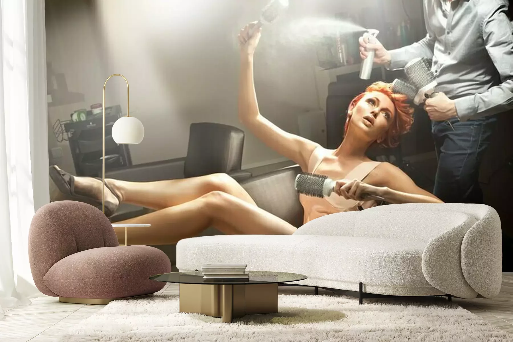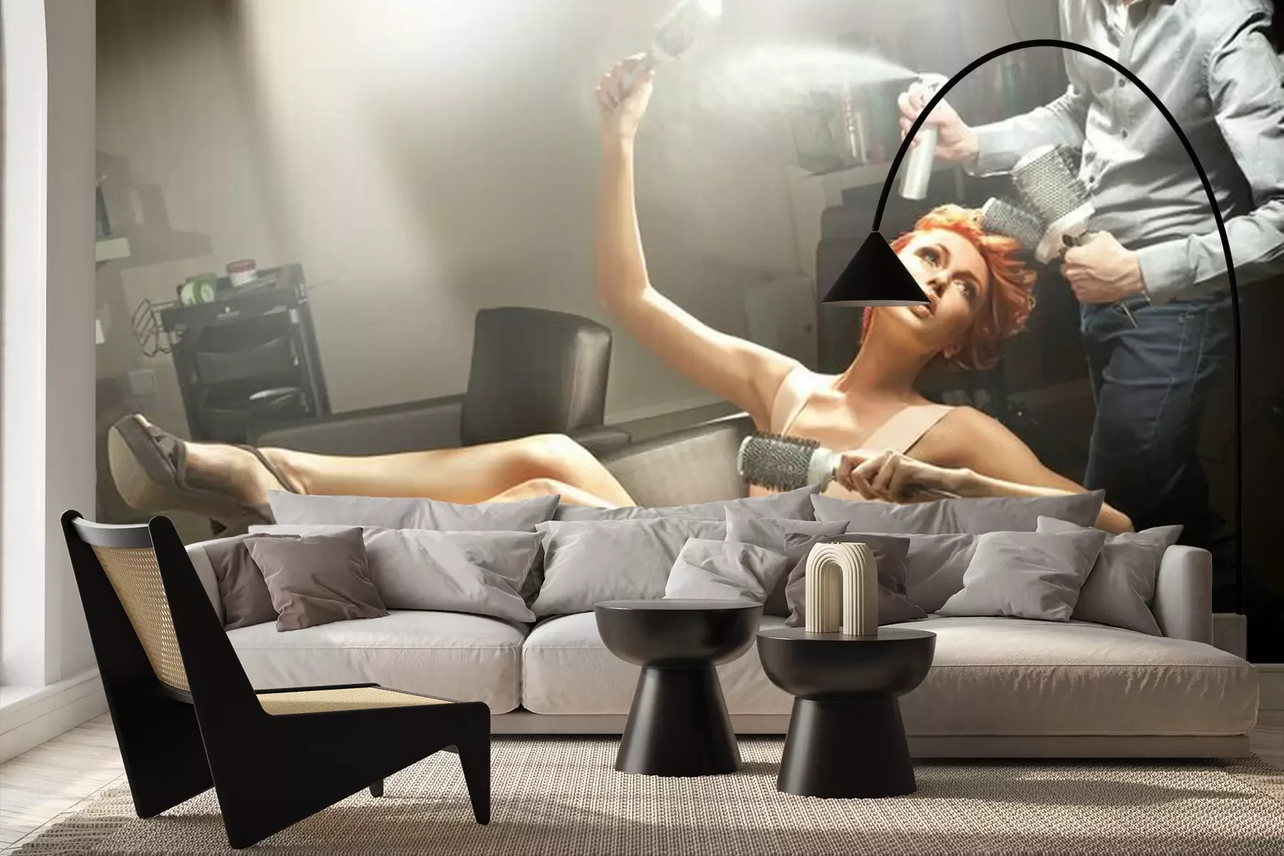 Fotobehang Jonge vrouw die zich in kapsalon kamer