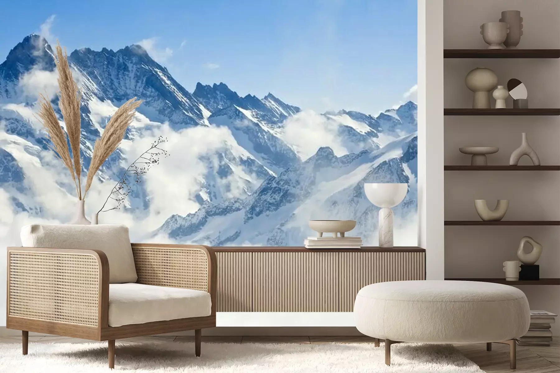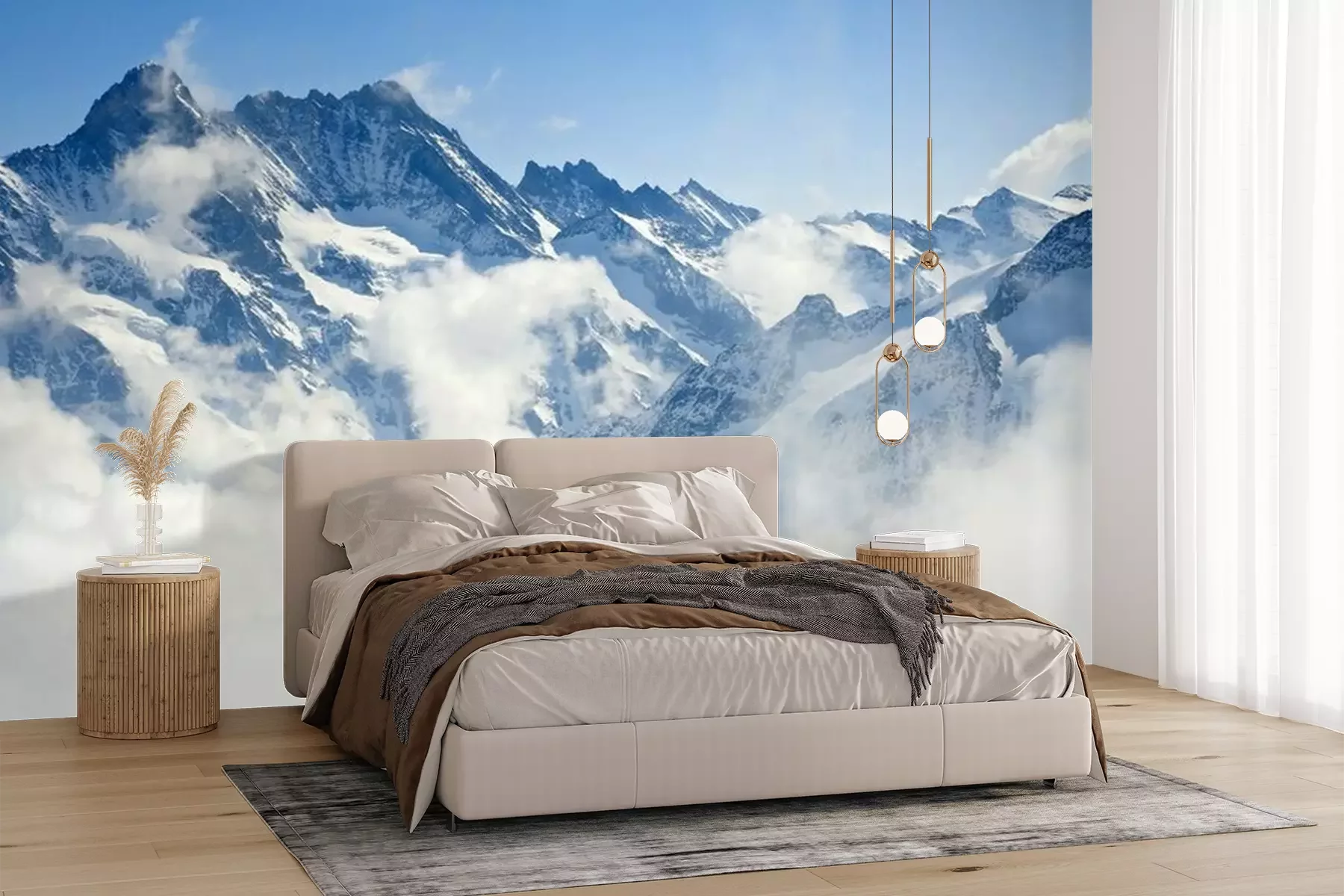 Het materiaal Premium+ is een gestructureerd vinyl op vlies met een gewicht van 255 g/m², dat kleine oneffenheden in de muur effectief camoufleert. De subtiele structuur van fijn zand geeft het oppervlak een exclusieve uitstraling, terwijl de halfmatte afwerking de diepte van de kleuren benadrukt. Het materiaal is dampdoorlatend, waardoor het ook in de keuken en badkamer kan worden gebruikt. De maximale breedte van één baan bedraagt 100 cm – bij grotere afmetingen wordt het fotobehang in meerdere gelijke banen verdeeld. De lijm wordt direct op de muur aangebracht en het behang wordt rand-aan-rand geplakt, wat zorgt voor een esthetisch resultaat zonder zichtbare naden. Het oppervlak kan gemakkelijk worden schoongemaakt door het voorzichtig af te nemen met een vochtige doek.