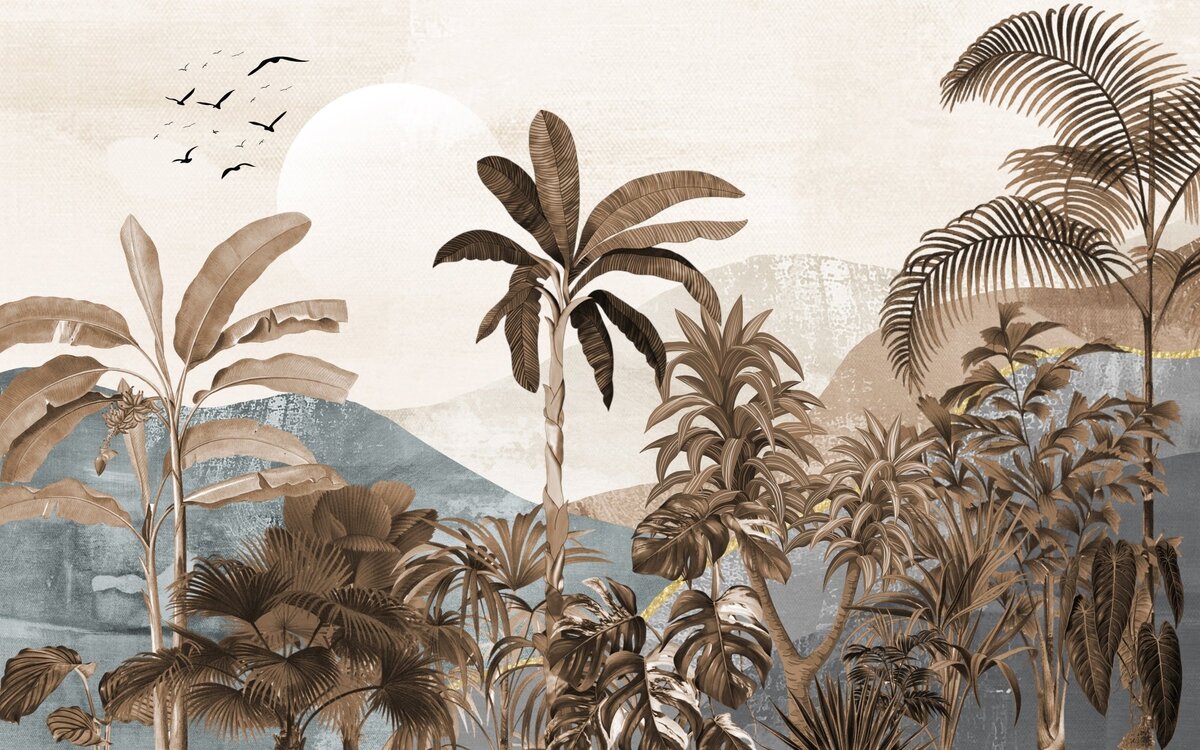 Fotobehang: Jungle met palmbomen tegen de achtergrond van bergen