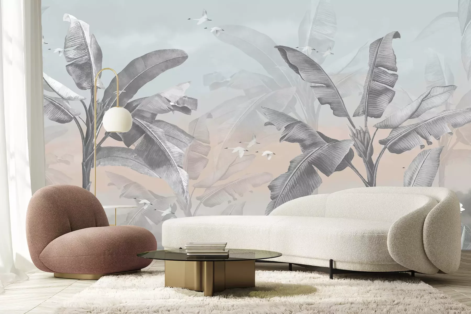 Pastelillustratie van bladeren en vlindersFotobehang