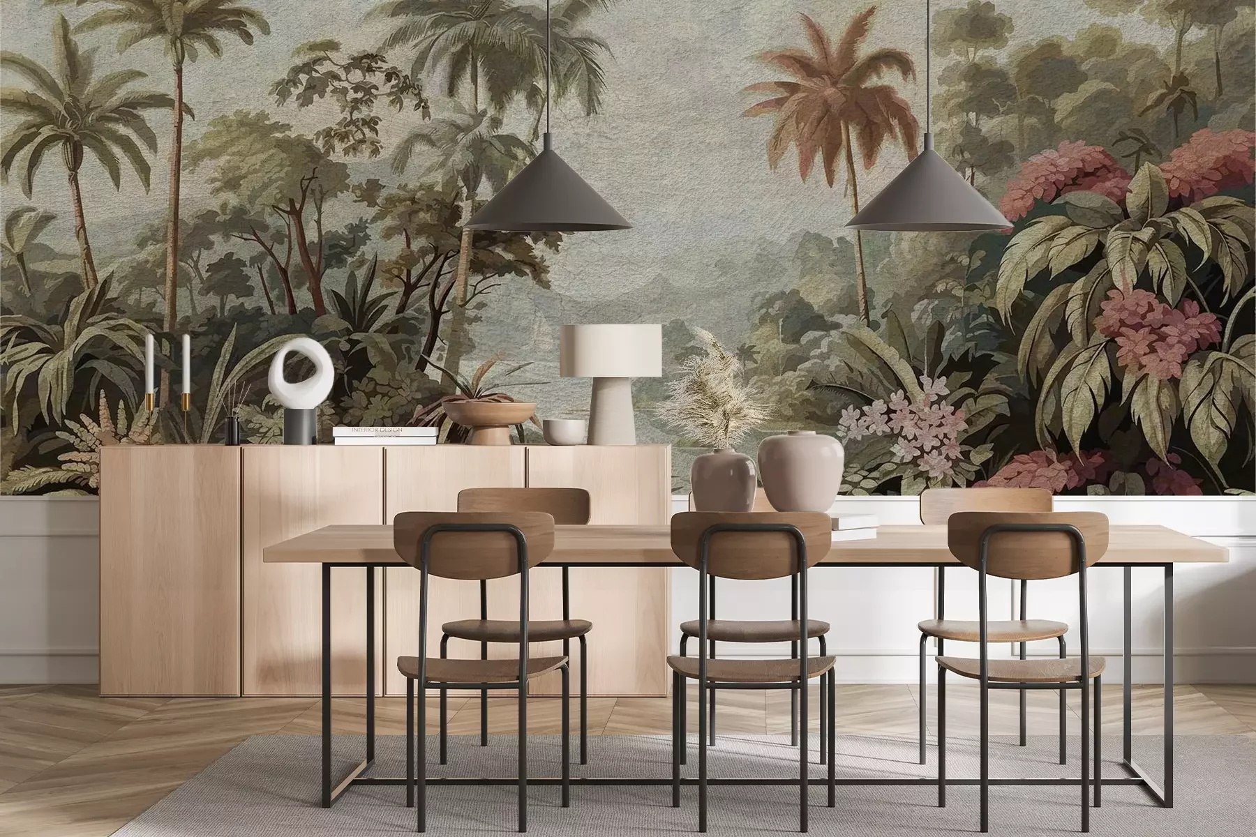 Het materiaal Premium+ is een gestructureerd vinyl op vlies met een gewicht van 255 g/m², dat kleine oneffenheden in de muur effectief camoufleert. De subtiele structuur van fijn zand geeft het oppervlak een exclusieve uitstraling, terwijl de halfmatte afwerking de diepte van de kleuren benadrukt. Het materiaal is dampdoorlatend, waardoor het ook in de keuken en badkamer kan worden gebruikt. De maximale breedte van één baan bedraagt 100 cm – bij grotere afmetingen wordt het fotobehang in meerdere gelijke banen verdeeld. De lijm wordt direct op de muur aangebracht en het behang wordt rand-aan-rand geplakt, wat zorgt voor een esthetisch resultaat zonder zichtbare naden. Het oppervlak kan gemakkelijk worden schoongemaakt door het voorzichtig af te nemen met een vochtige doek.