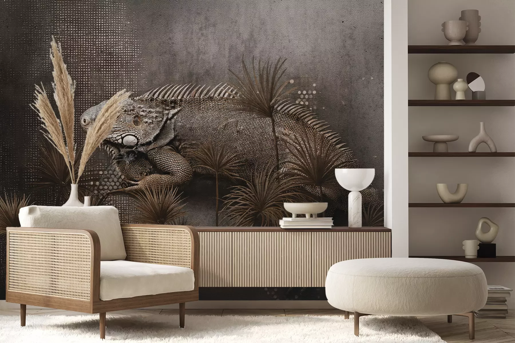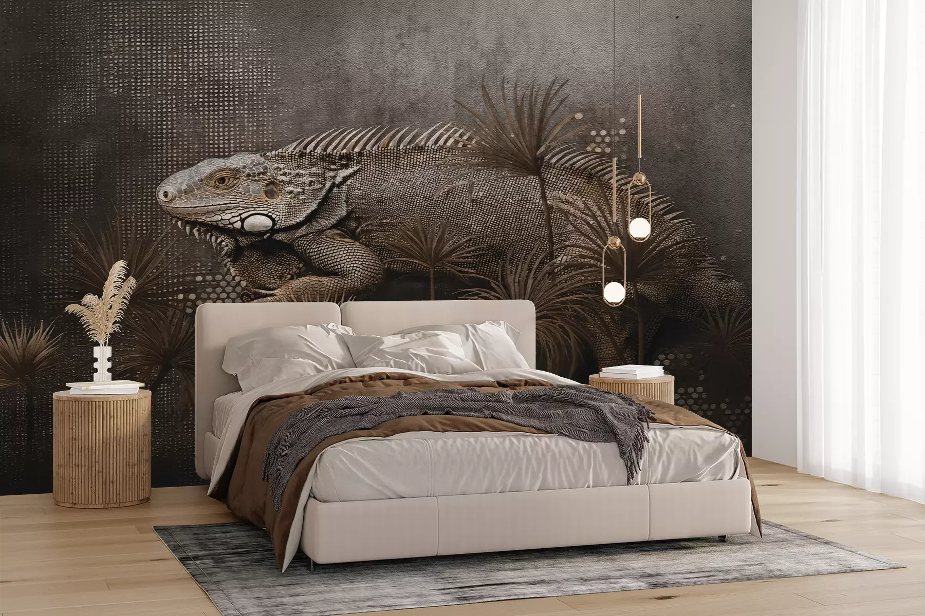Het materiaal Premium+ is een gestructureerd vinyl op vlies met een gewicht van 255 g/m², dat kleine oneffenheden in de muur effectief camoufleert. De subtiele structuur van fijn zand geeft het oppervlak een exclusieve uitstraling, terwijl de halfmatte afwerking de diepte van de kleuren benadrukt. Het materiaal is dampdoorlatend, waardoor het ook in de keuken en badkamer kan worden gebruikt. De maximale breedte van één baan bedraagt 100 cm – bij grotere afmetingen wordt het fotobehang in meerdere gelijke banen verdeeld. De lijm wordt direct op de muur aangebracht en het behang wordt rand-aan-rand geplakt, wat zorgt voor een esthetisch resultaat zonder zichtbare naden. Het oppervlak kan gemakkelijk worden schoongemaakt door het voorzichtig af te nemen met een vochtige doek.