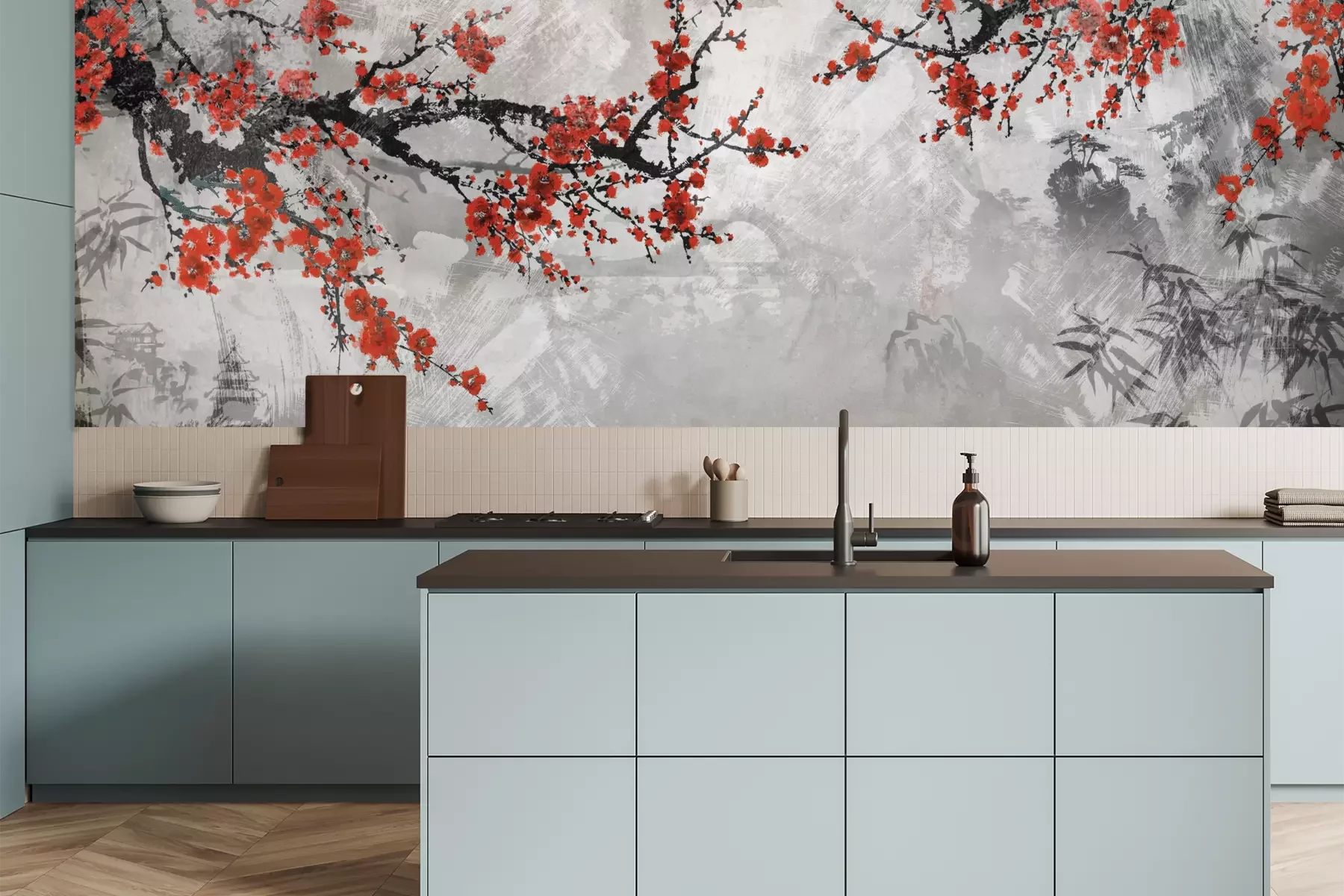Het materiaal Premium is een glad vinyl op vlies, dat bestand is tegen uitrekken en vervorming. Het is dampdoorlatend – de muren kunnen vrij ademen – waardoor het geschikt is voor gebruik in de keuken en badkamer. Bij vervuiling kan het materiaal worden afgenomen met een vochtige doek. De maximale breedte van één baan bedraagt 95 of 105 cm, afhankelijk van de beschikbaarheid. Montage vindt plaats met de rand-aan-rand methode, wat een esthetisch resultaat zonder zichtbare naden oplevert. Omdat de lijm rechtstreeks op de muur wordt aangebracht, verloopt de installatie van het fotobehang snel en eenvoudig.