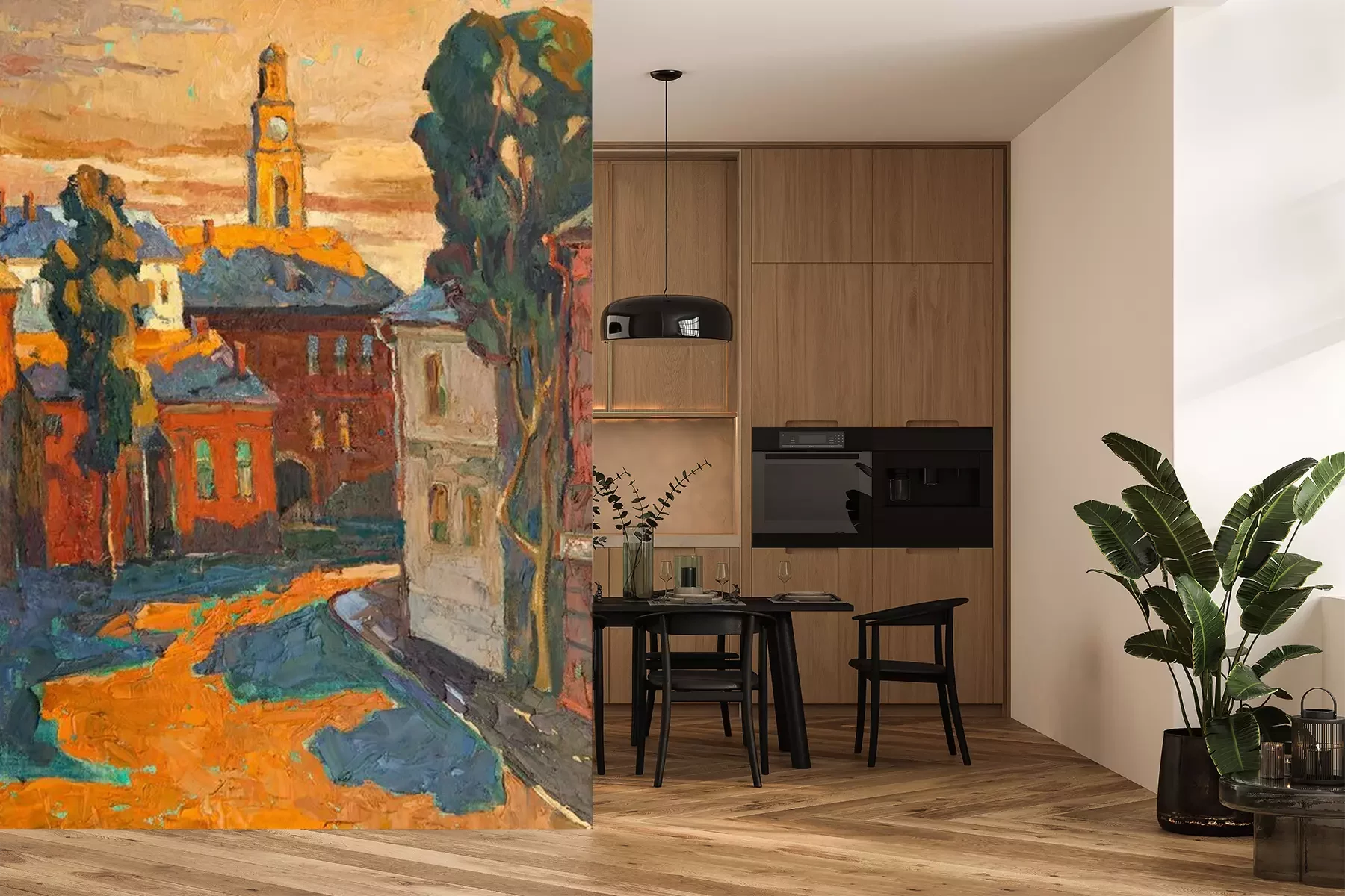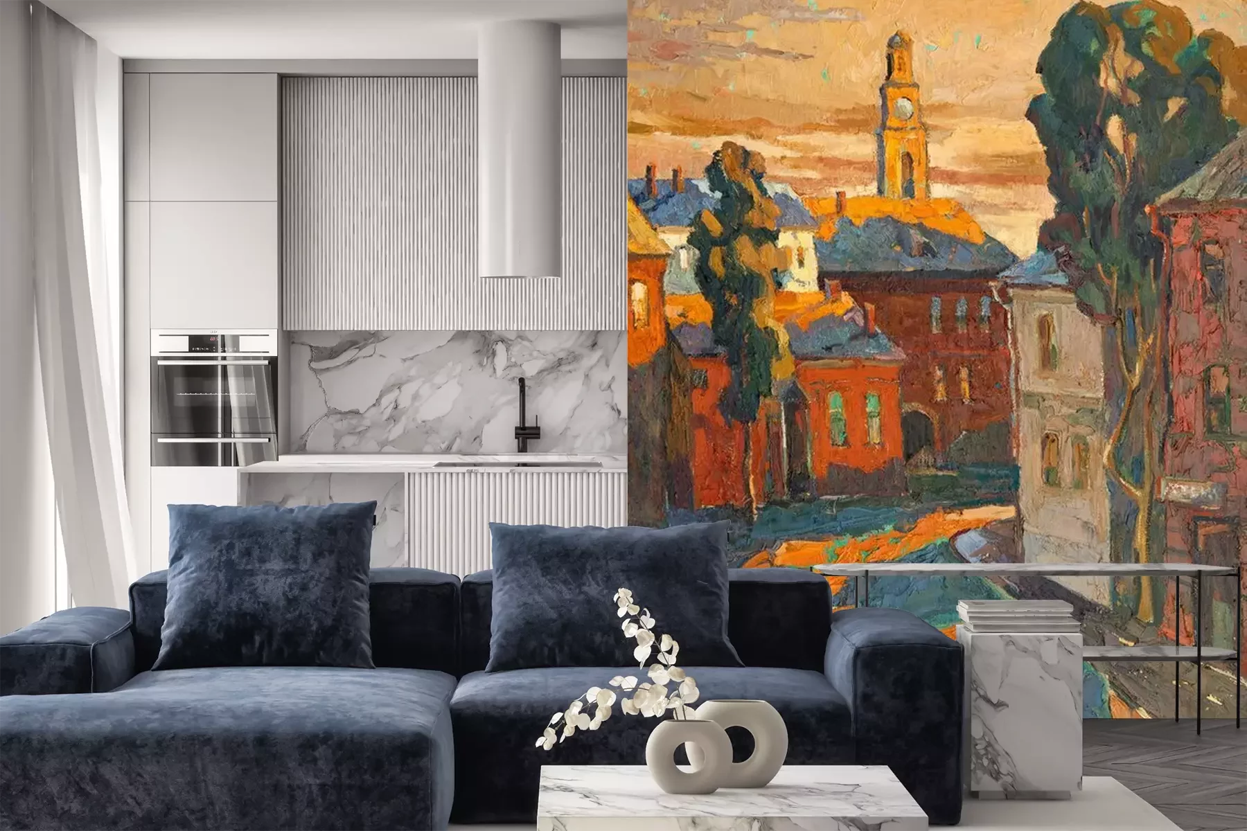 Het materiaal Premium+ is een gestructureerd vinyl op vlies met een gewicht van 255 g/m², dat kleine oneffenheden in de muur effectief camoufleert. De subtiele structuur van fijn zand geeft het oppervlak een exclusieve uitstraling, terwijl de halfmatte afwerking de diepte van de kleuren benadrukt. Het materiaal is dampdoorlatend, waardoor het ook in de keuken en badkamer kan worden gebruikt. De maximale breedte van één baan bedraagt 100 cm – bij grotere afmetingen wordt het fotobehang in meerdere gelijke banen verdeeld. De lijm wordt direct op de muur aangebracht en het behang wordt rand-aan-rand geplakt, wat zorgt voor een esthetisch resultaat zonder zichtbare naden. Het oppervlak kan gemakkelijk worden schoongemaakt door het voorzichtig af te nemen met een vochtige doek.
