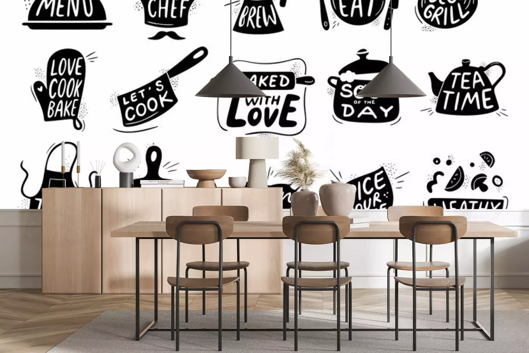 Fotobehang Kitchen food lettering. Gourmet cooking foods badge, chicken recipes cook and restaurant menu letterings vector illustration set