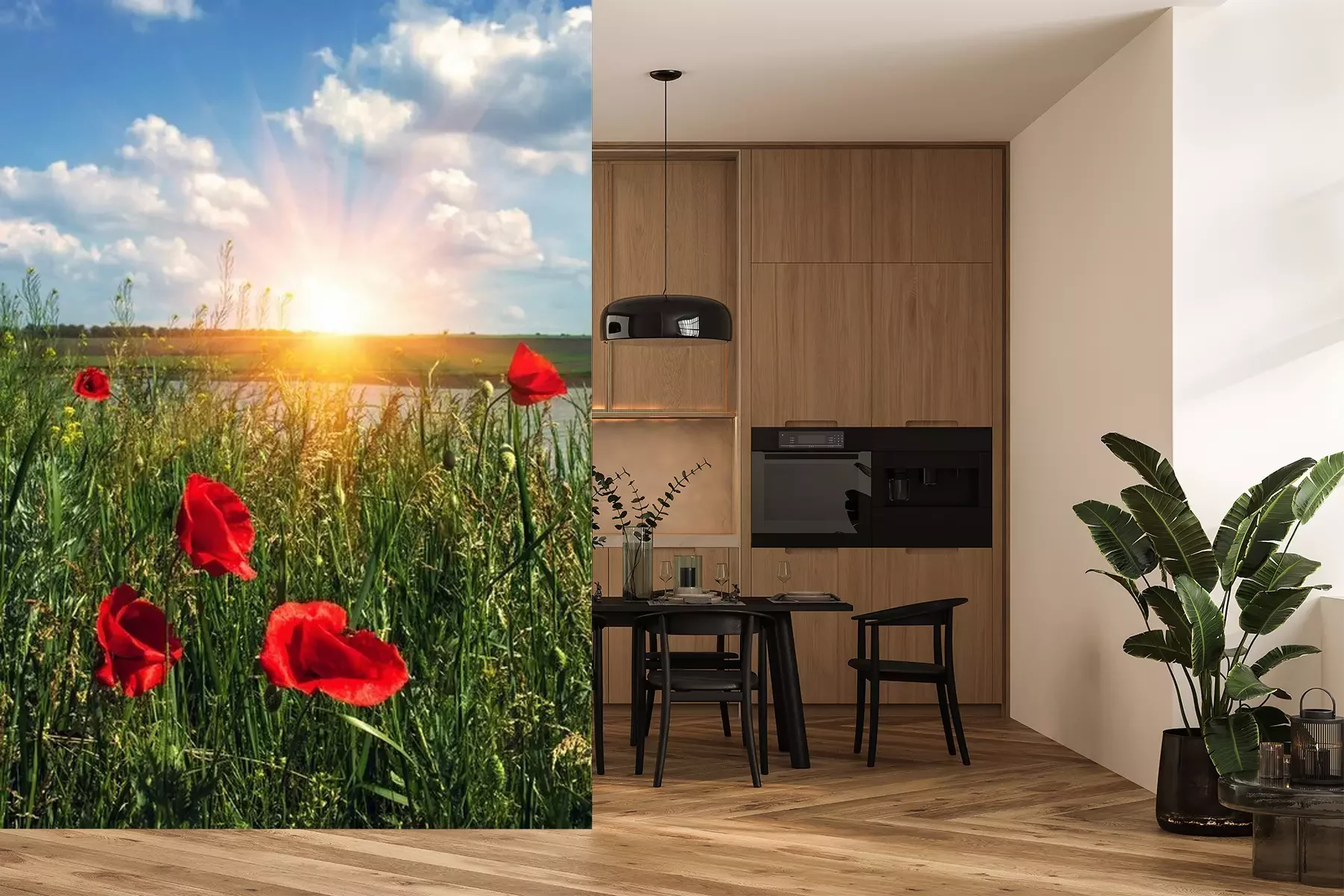 Het materiaal Premium is een glad vinyl op vlies, dat bestand is tegen uitrekken en vervorming. Het is dampdoorlatend – de muren kunnen vrij ademen – waardoor het geschikt is voor gebruik in de keuken en badkamer. Bij vervuiling kan het materiaal worden afgenomen met een vochtige doek. De maximale breedte van één baan bedraagt 95 of 105 cm, afhankelijk van de beschikbaarheid. Montage vindt plaats met de rand-aan-rand methode, wat een esthetisch resultaat zonder zichtbare naden oplevert. Omdat de lijm rechtstreeks op de muur wordt aangebracht, verloopt de installatie van het fotobehang snel en eenvoudig.